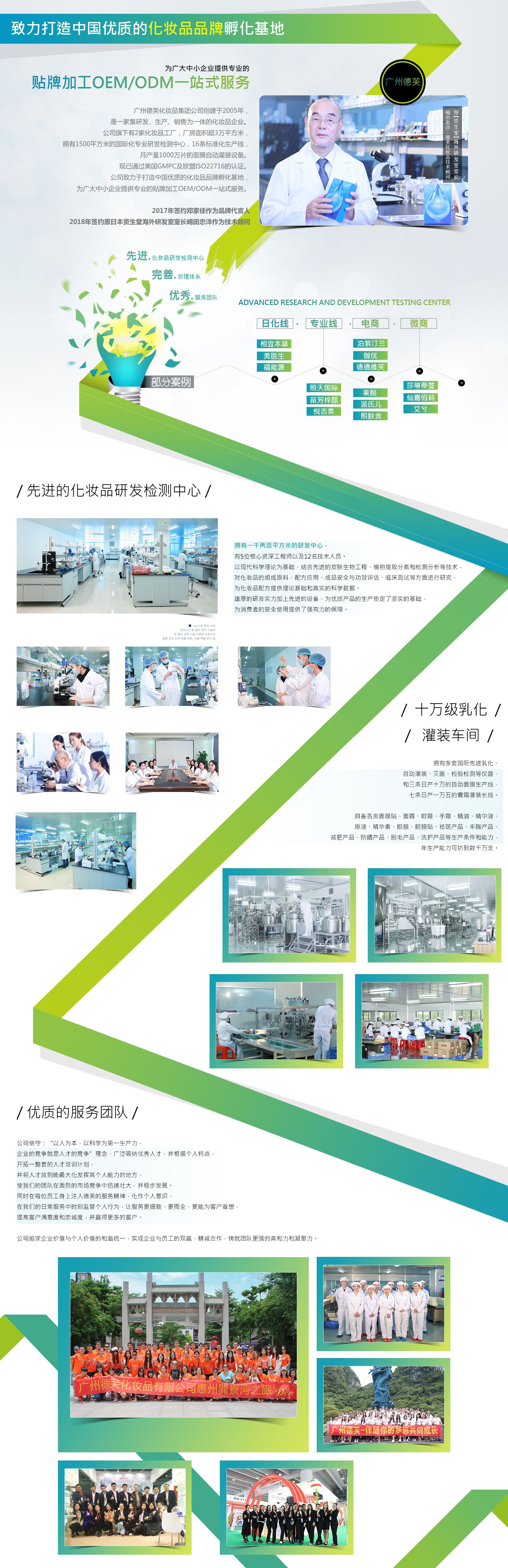廣州德芙化妝品集團(tuán)公司創(chuàng)建于2005年,注冊(cè)資金2500萬(wàn)元。 是一家集研發(fā)、生產(chǎn)、銷售為一體的化妝品企業(yè)。公司旗下有2家 大型化妝品工廠,廠房面積超3萬(wàn)平方米,擁有1500平方米的國(guó) 際化專業(yè)研發(fā)檢測(cè)中心,16條標(biāo)準(zhǔn)化生產(chǎn)線,月產(chǎn)量1000萬(wàn)片的 面膜自動(dòng)灌裝設(shè)備。現(xiàn)已通過(guò)美國(guó)GMPC及歐盟ISO22716的認(rèn)證。 公司致力于打造中國(guó)優(yōu)質(zhì)的化妝品品牌孵化基地,為廣大中小 企業(yè)提供專業(yè)的貼牌加工OEM/ODM一站式服務(wù)。