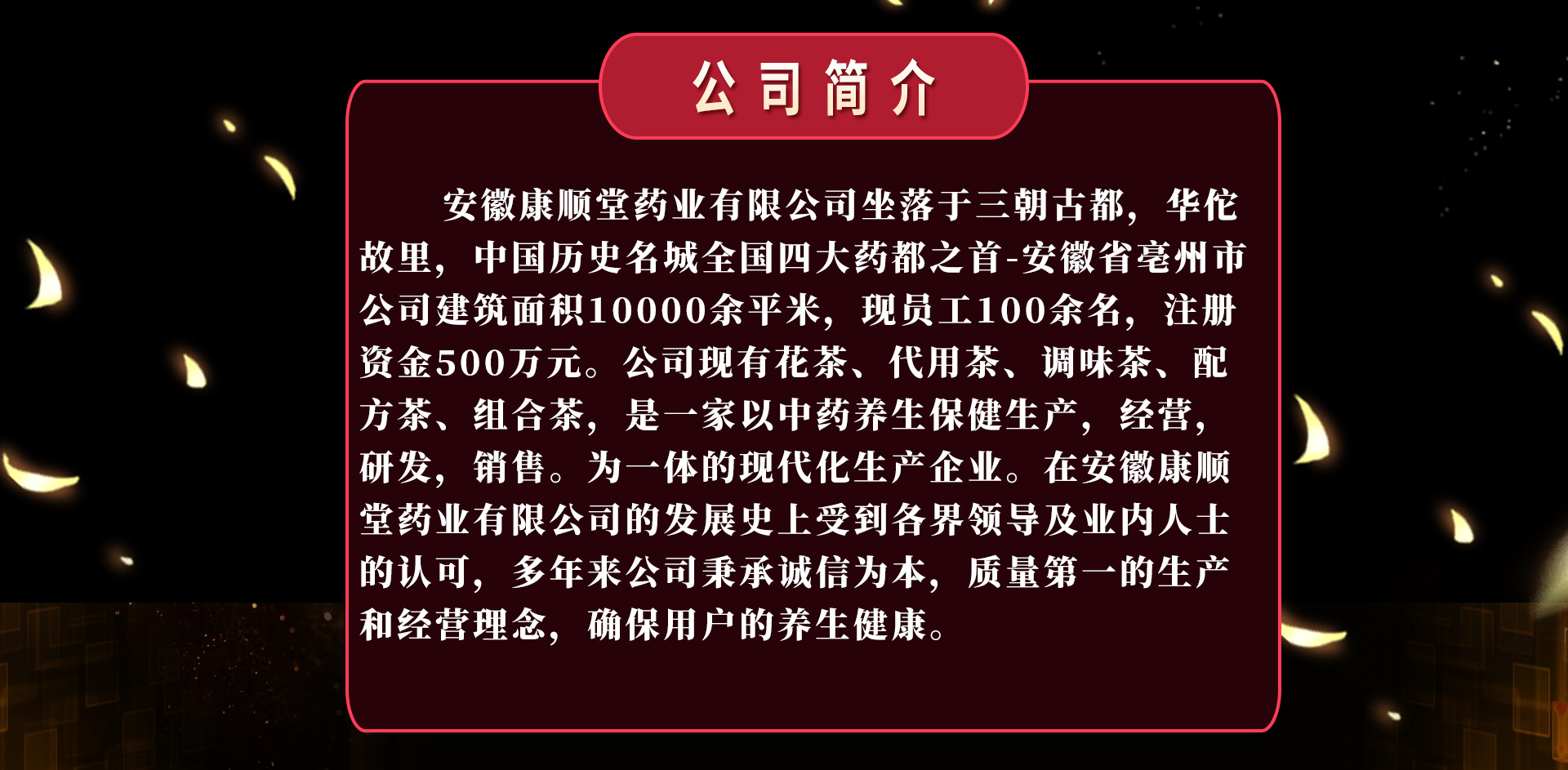 安徽康順堂藥業有限公司是代用茶、代用茶等產品專業生產加工的公司,擁有完整、科學的質量管理體系。安徽康順堂藥業有限公司的誠信、實力和產品質量獲得業界的認可。歡迎各界朋友蒞臨參觀、指導和業務洽談。