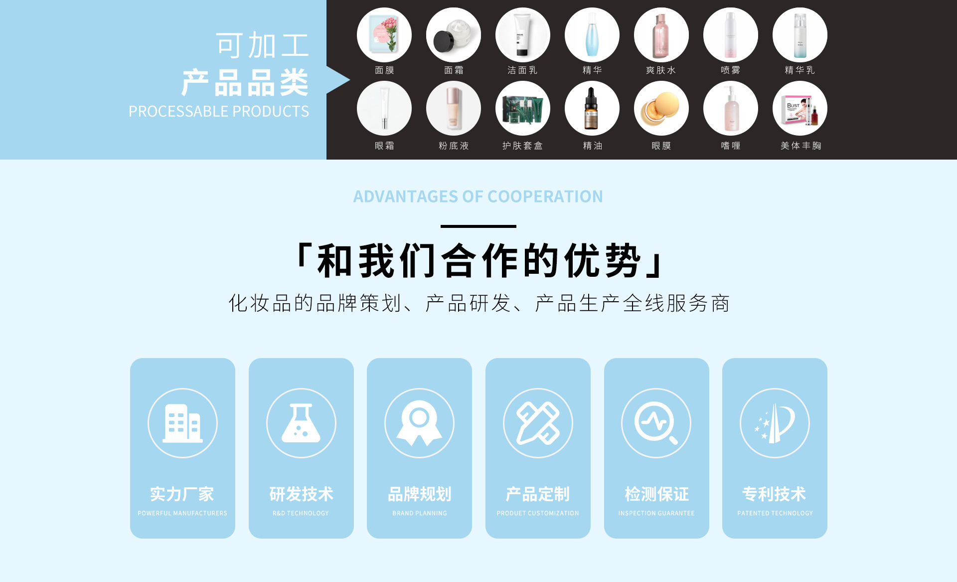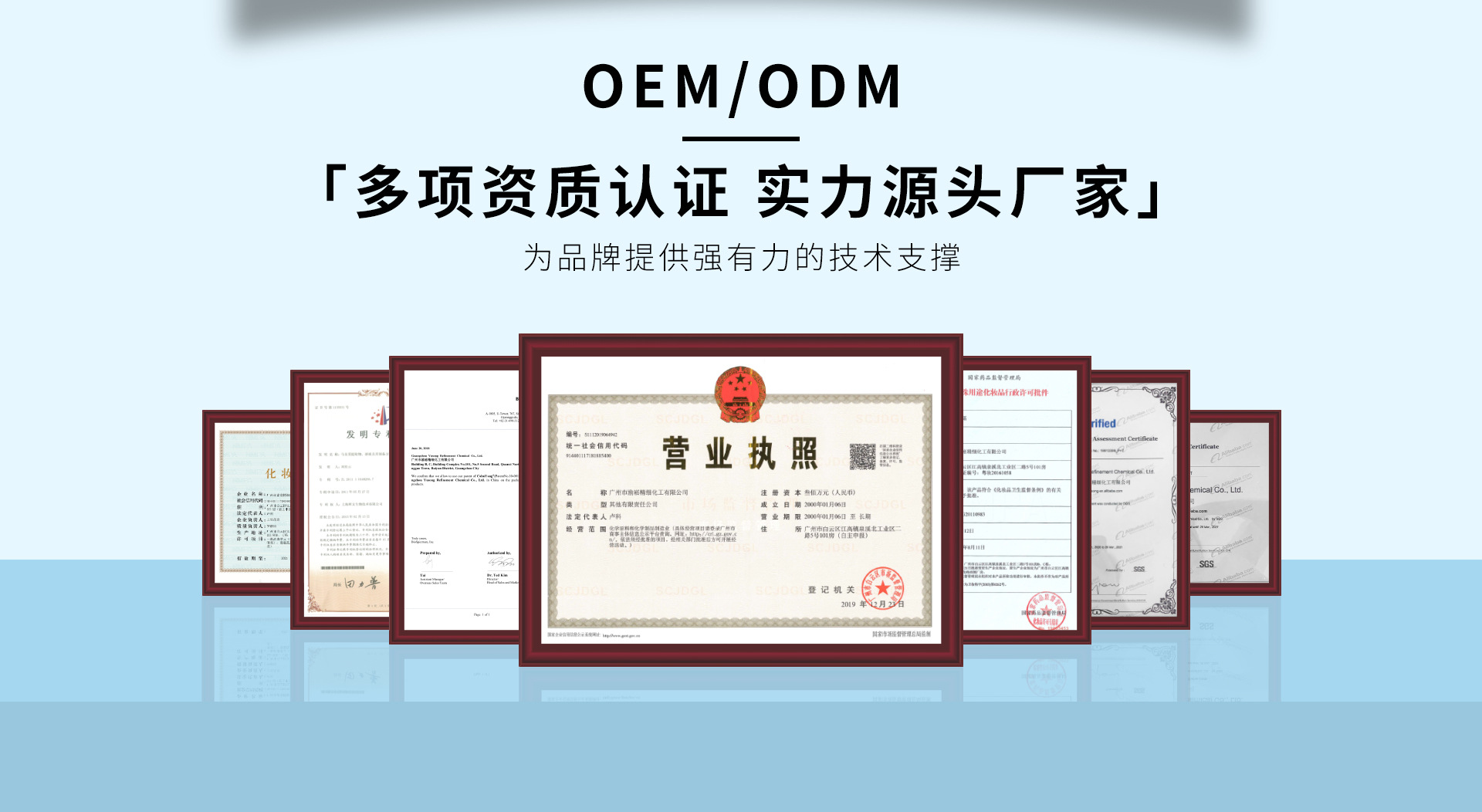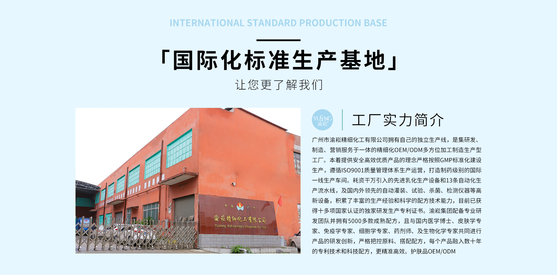 廣州市渝崧精細化工有限公司擁有自己的獨立生產線,是集研發、制造、營銷服務于一體的精細化OEM/ODM多方位加工制造生產型工廠。本著提供安全高效優質產品的理念嚴格按照GMP標準化建設生產,遵循ISO9001質量管理體系生產運營,打造制藥級別的國際一線生產車間。耗資干萬引入的先進乳化生產設備和13條自動化生產流水線,及國內外領先的自動灌裝、試驗、殺菌、檢測儀器等高新設備,積累了豐富的生產經驗和科學的配方技術能力,目前已獲得十多項國家認證的獨家研發生產專利證書。渝崧集團配備專業研發團隊并擁有5000多款成熟配方,且與國內醫學博士、皮膚學專家、免疫學專家、細胞學專家、藥劑師、及生物化學專家共同進行產品的研發創新,嚴格把控原料、搭配配方,每個產品融入數十年的專利技術和科技配方,更精準高效。護膚品OEM/ODM