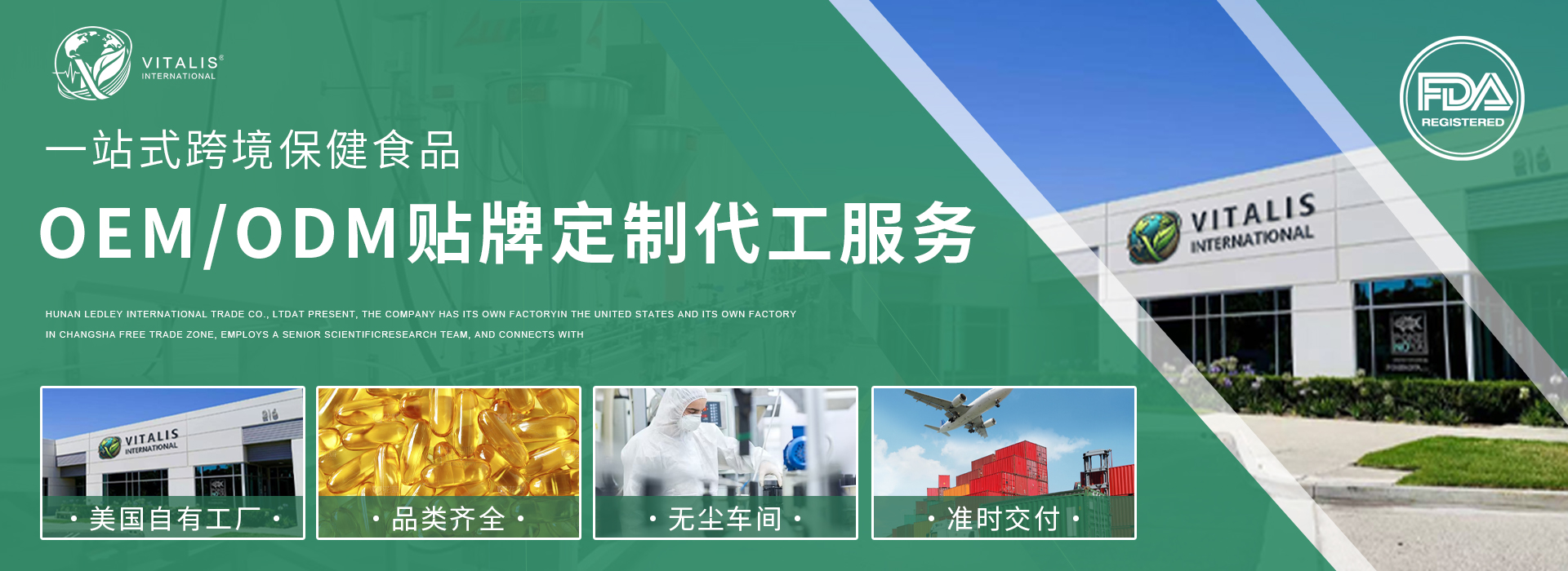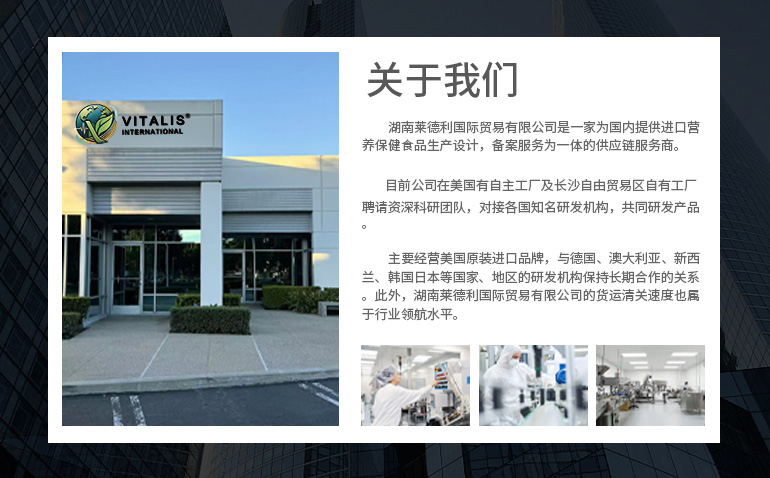 湖南萊德利國際貿易有限公司,是一家為國內提供進口營養保健食品生產,設計,備案服務為一體的供應鏈服務商,目前公司在美國有自主工廠及長沙自由貿易區自有工廠,聘請資深科研團隊,對接各國知名研發機構,共同研發產品。