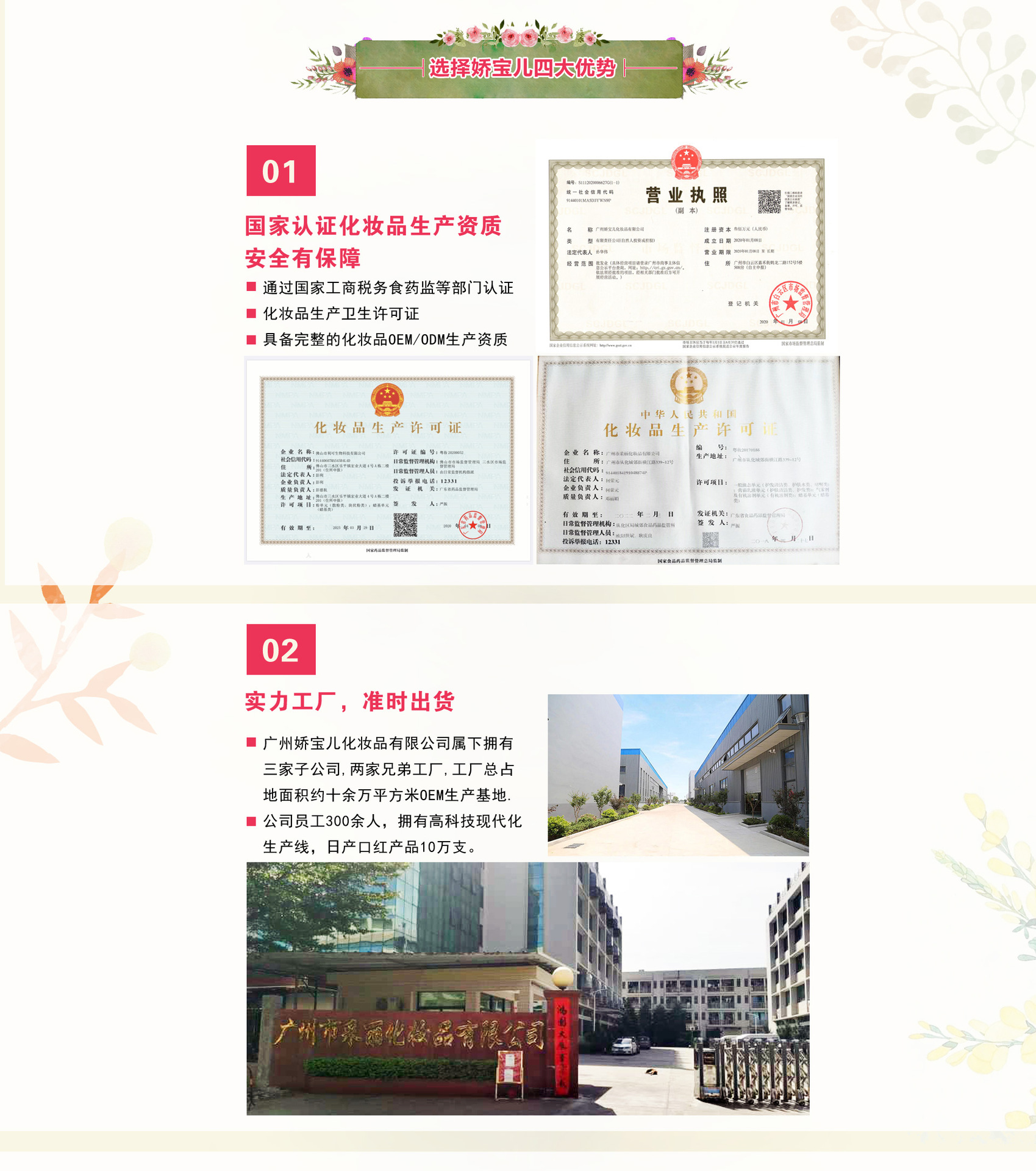 1、 通過國家工商稅務食藥監等部門認證,化妝品生產衛生許可證,具備完整的化妝品OEM生產資質。 2、 廣州嬌寶兒化妝品有限公司屬下擁有三家子公司,兩家兄弟工廠,工廠總占地面積約十余萬平方米的OEM生產基地。 公司員工300余人,擁有高科技現代化生產線,日產口紅產口10萬支。 超過2000平方米的國際標準實驗室。 3、 專業化的以市場為導向的專業研發中心 公司擁有50人研發中心,擁有1000多款成熟配方,緊跟國際市場,助您搶占先機 公司原創的中國風口紅上線各大電商平臺,創造月銷量數十萬支的佳績。 4、全球優選化妝品原料 公司全部采用進口技術,全球優選化妝品優質原料,主要化妝品原料都來自于韓國、日本、法國、美國等頂級原料供應商,堅持從正規渠道采購,保證原料的品質及安全。 公司目前自有品牌:SOZK、SKRC、MOEKAWAY、艷千古、Coiuln Kivln等品牌