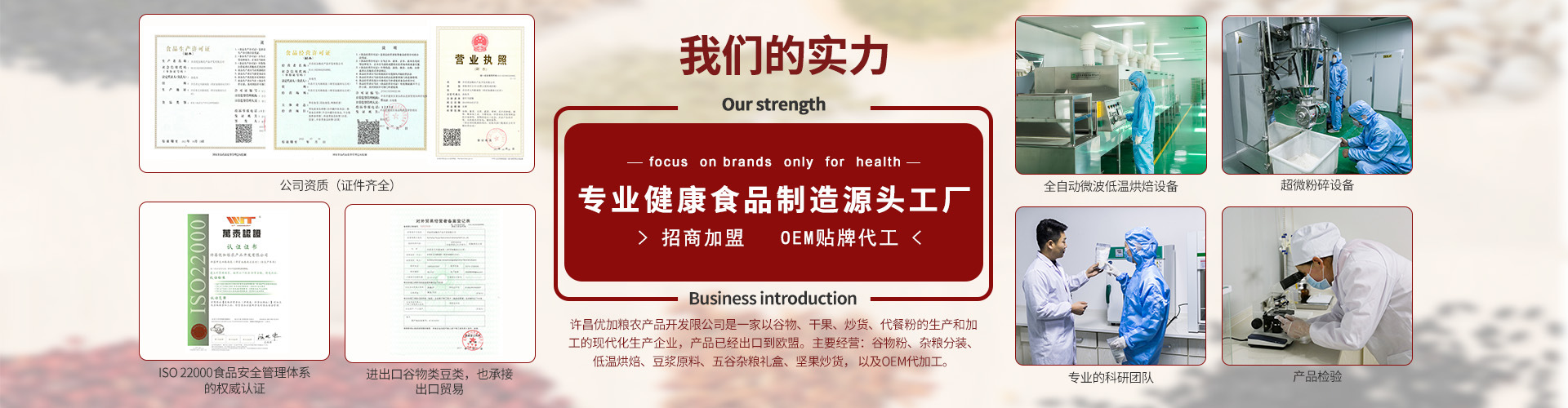 許昌優(yōu)加糧農(nóng)產(chǎn)品開發(fā)有限公司成立于2013年3月,占地300余畝,總投資6000萬元,廠房車間6000平方米。公司建有標(biāo)準(zhǔn)化食品生產(chǎn)車間,五谷雜糧加工生產(chǎn)線、方便食品自動化生產(chǎn)線、花果茶分裝生產(chǎn)線、炒貨食品及堅(jiān)果制品分裝線、水果制品分裝線,產(chǎn)品種類達(dá)到上百種。