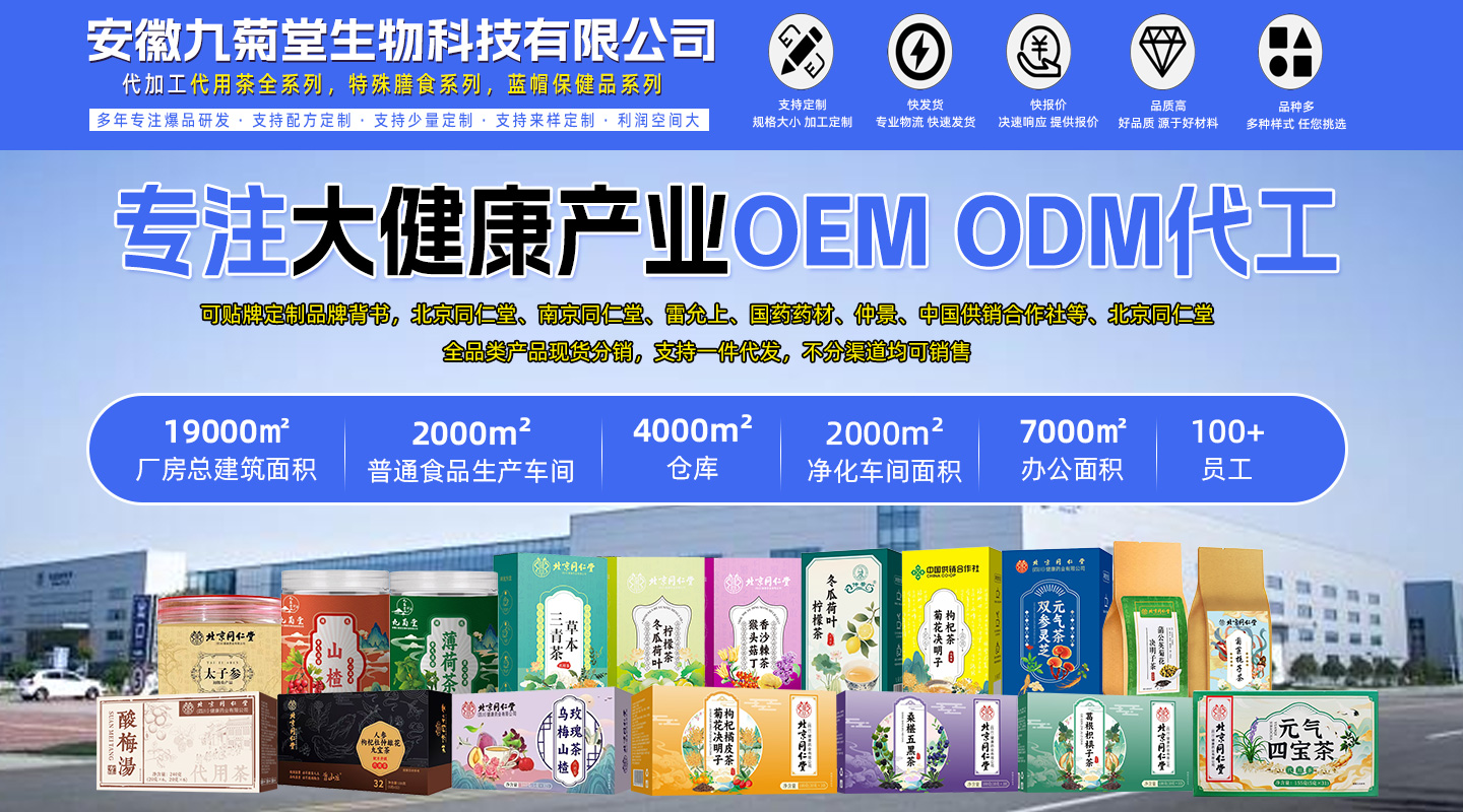 公司現與客戶有多種合作模式。公司擁有自主品牌商“九菊堂”,可直接定制生產,現貨供應;委托加工,為客戶生產自有品牌產品,減少客戶生產環節流程,減少產品生產周期,減低產品成本;貼牌代工,公司與北京同仁堂、南京同仁堂等多家知名品牌有長期合作,可選擇暢銷產品進行定制生產,依托大品牌對產品進行賦能。歡迎大家前來洽談,合作共贏。