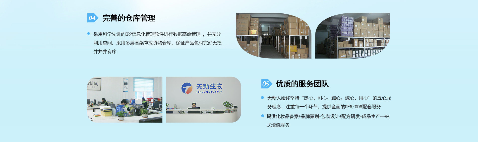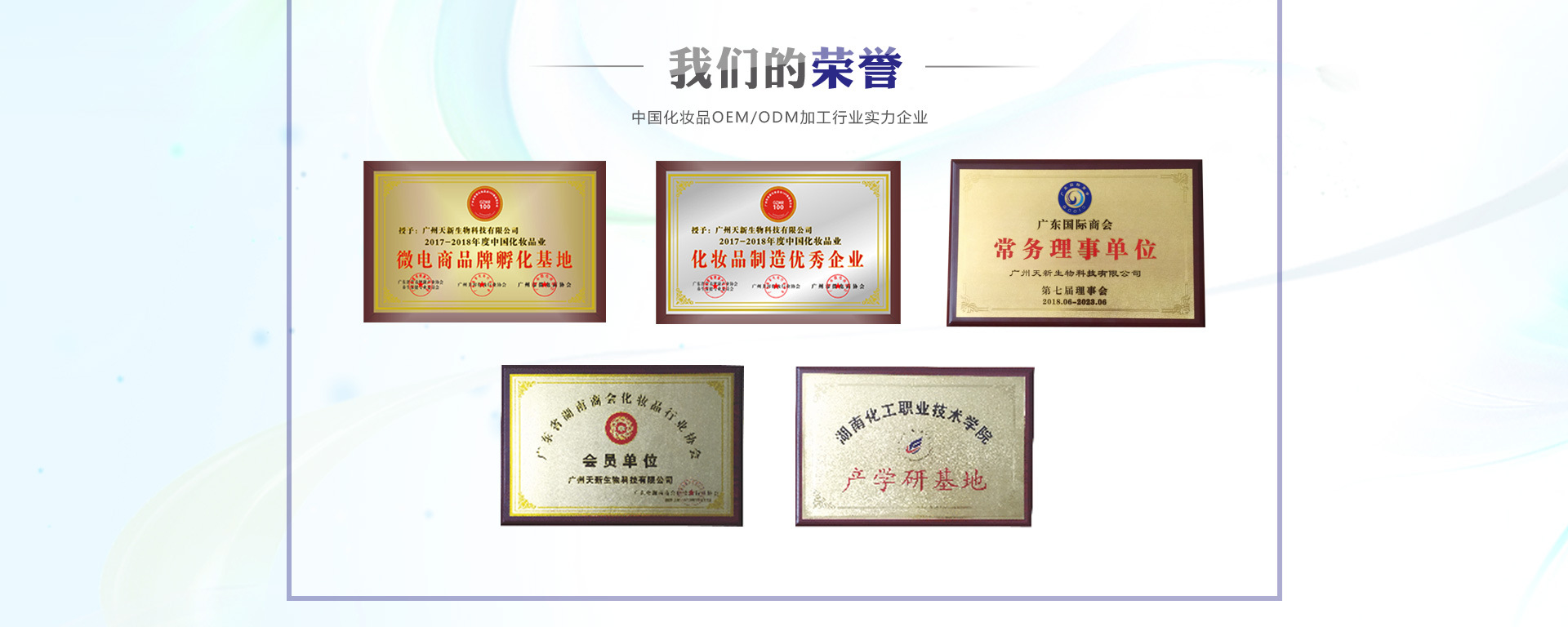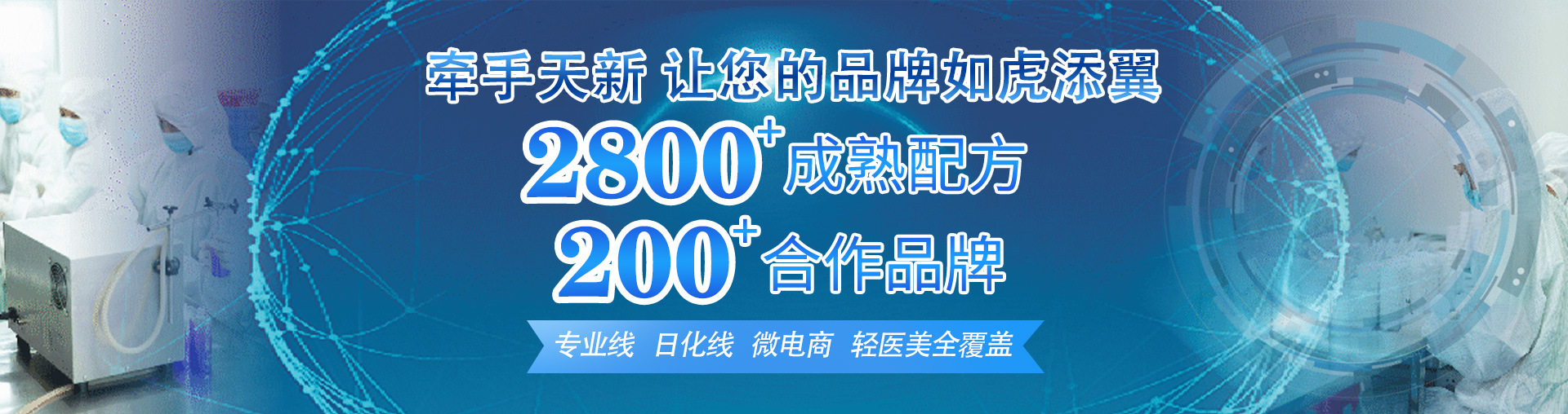廣州天新生物科技有限公司是一家集研發、生產、培訓、售后服務為一體的高科技化妝品企業,專注于化妝品品牌及半成品OEM/ODM加工,公司擁有1萬多平方標準GMP廠房,全新高科技機械設備和強大的具有數十年研發經驗技術骨干。除了國內市場同時也與美國、英國、日本、法國、新加坡、澳大利亞、中東、非洲等十多個國家和地區客戶建立了良好的合作關系。
