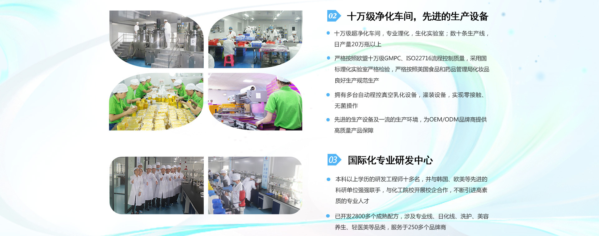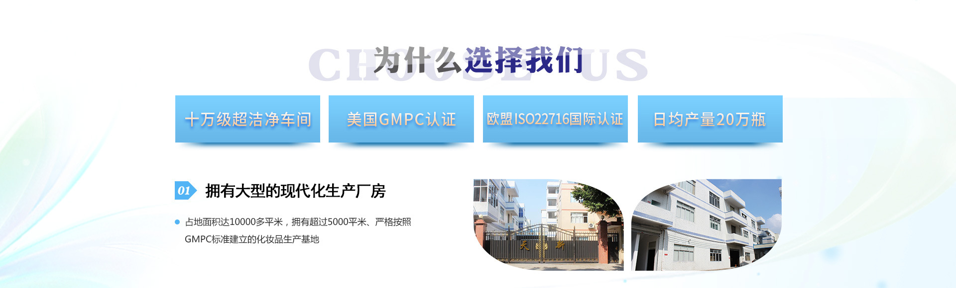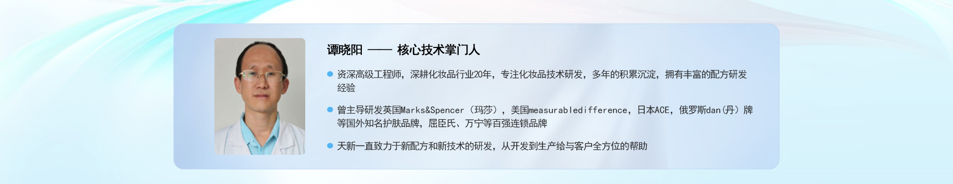廣州天新生物科技有限公司是一家集研發、生產、培訓、售后服務為一體的高科技化妝品企業,專注于化妝品品牌及半成品OEM/ODM加工,公司擁有1萬多平方標準GMP廠房,全新高科技機械設備和強大的具有數十年研發經驗技術骨干。除了國內市場同時也與美國、英國、日本、法國、新加坡、澳大利亞、中東、非洲等十多個國家和地區客戶建立了良好的合作關系。