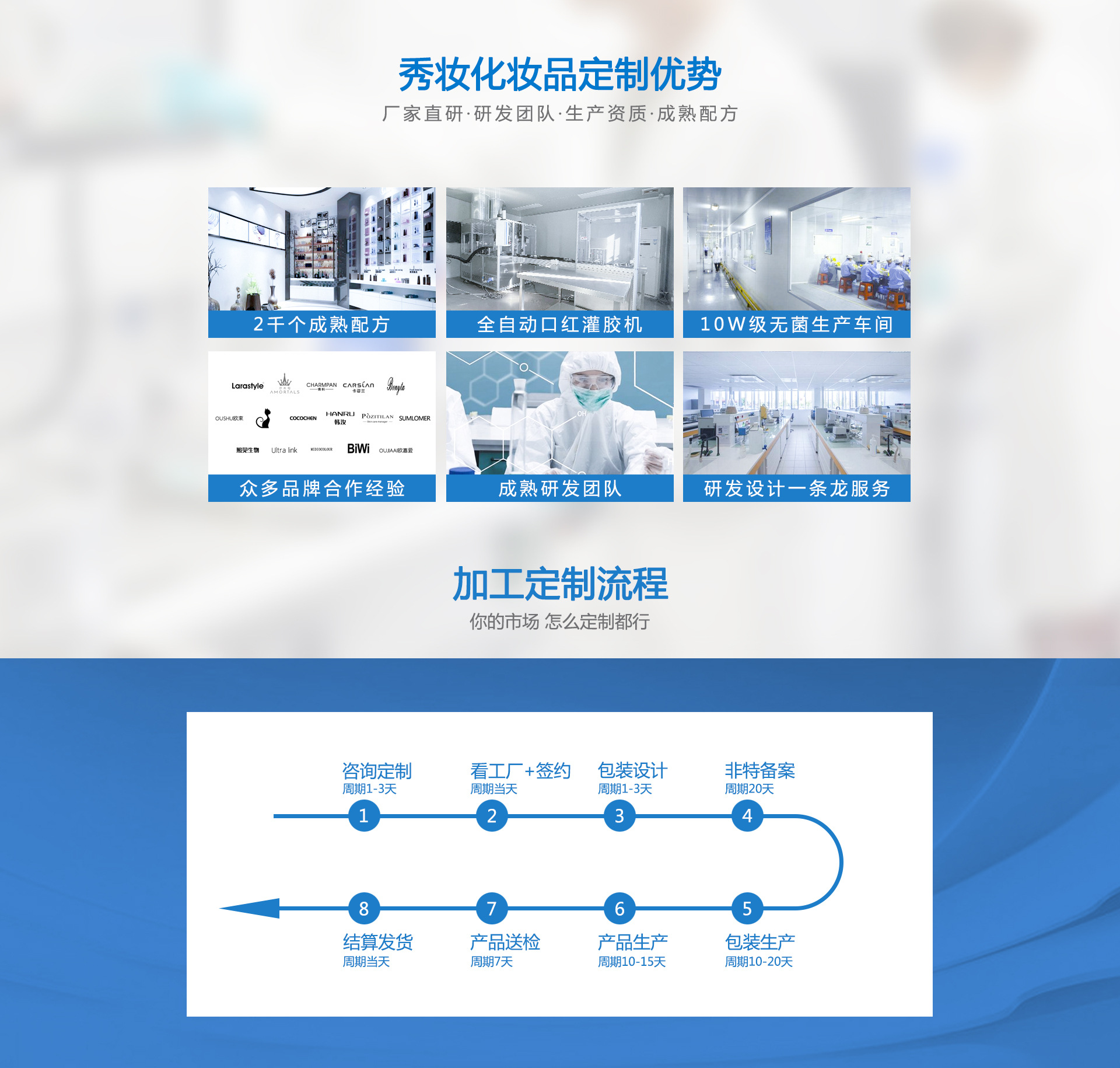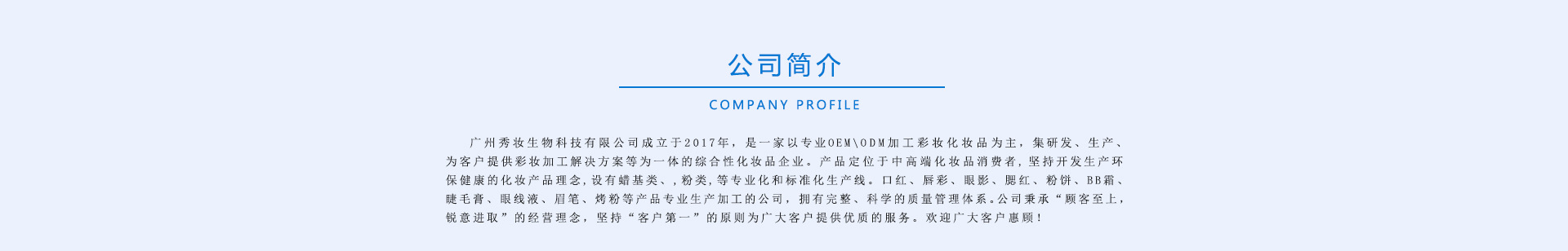 廣州秀妝生物科技有限公司成立于2017年,是一家以專業OEM\ODM加工彩妝化妝品為主,集研發、生產、為客戶提供彩妝加工解決方案等為一體的綜合性化妝品企業。產品定位于中高端化妝品消費者,堅持開發生產環保健康的化妝產品理念,設有蠟基類、,粉類,等專業化和標準化生產線。口紅、唇彩、眼影、腮紅、粉餅、BB霜、睫毛膏、眼線液、眉筆、烤粉等產品專業生產加工的公司,擁有完整、科學的質量管理體系。 公司秉承“顧客至上,銳意進取”的經營理念,堅持“客戶第一”的原則為廣大客戶提供優質的服務。歡迎廣大客戶惠顧