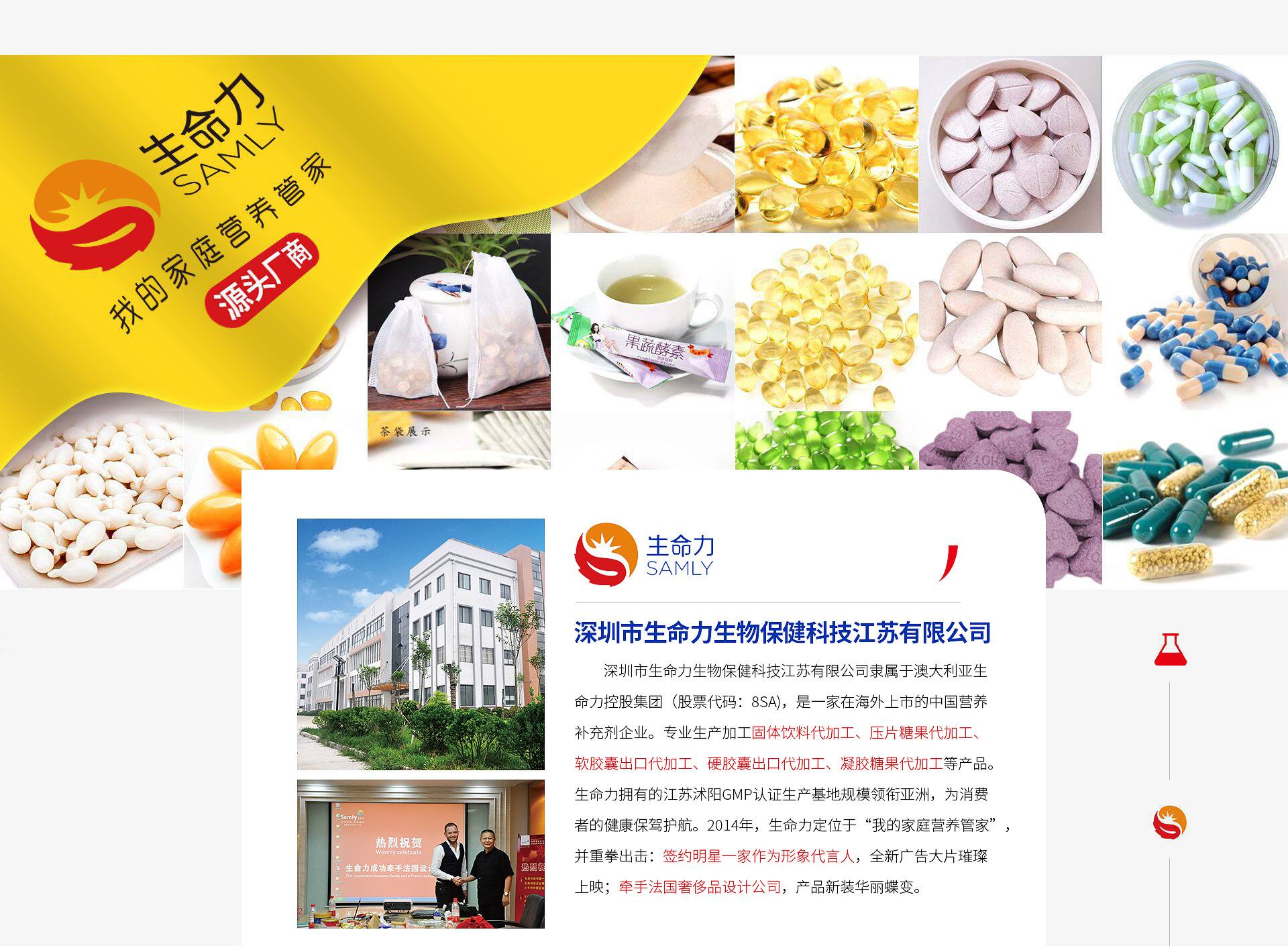 深圳市生命力生物保健科技江蘇有限公司成立于1996年,21年來一直專注營養食品,保健品的研發及生產,旗下擁有“生命力”,“紐徠佛”,“富恩堂”,等諸多品牌。2014年年底生命力通過國家高新技術企業認證,具備iso22000及出口商檢資質。