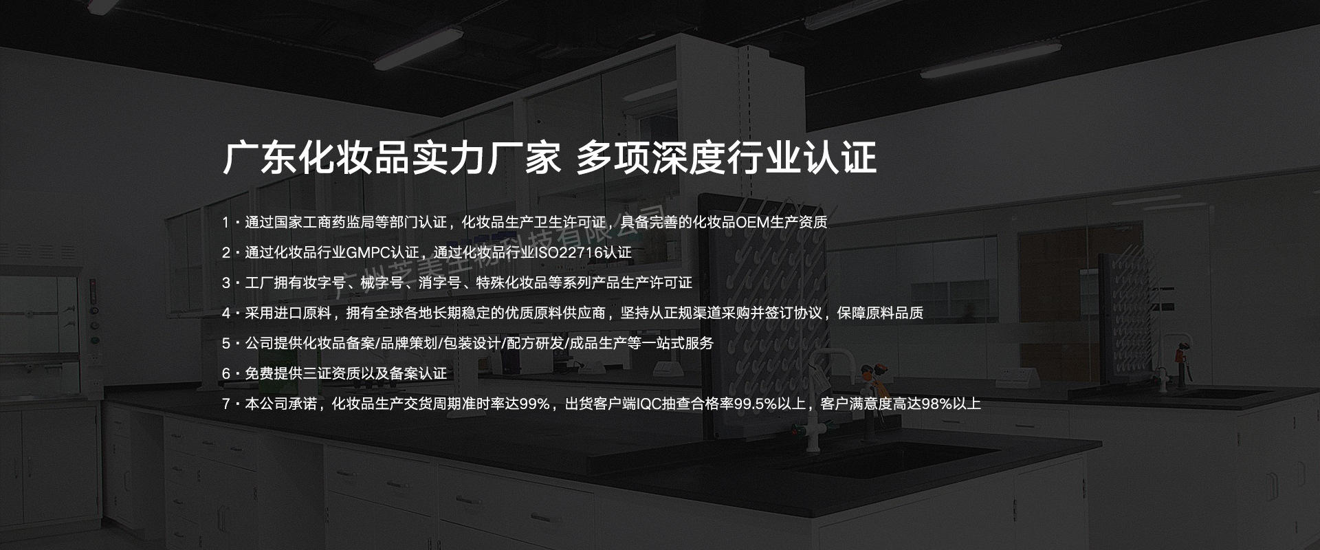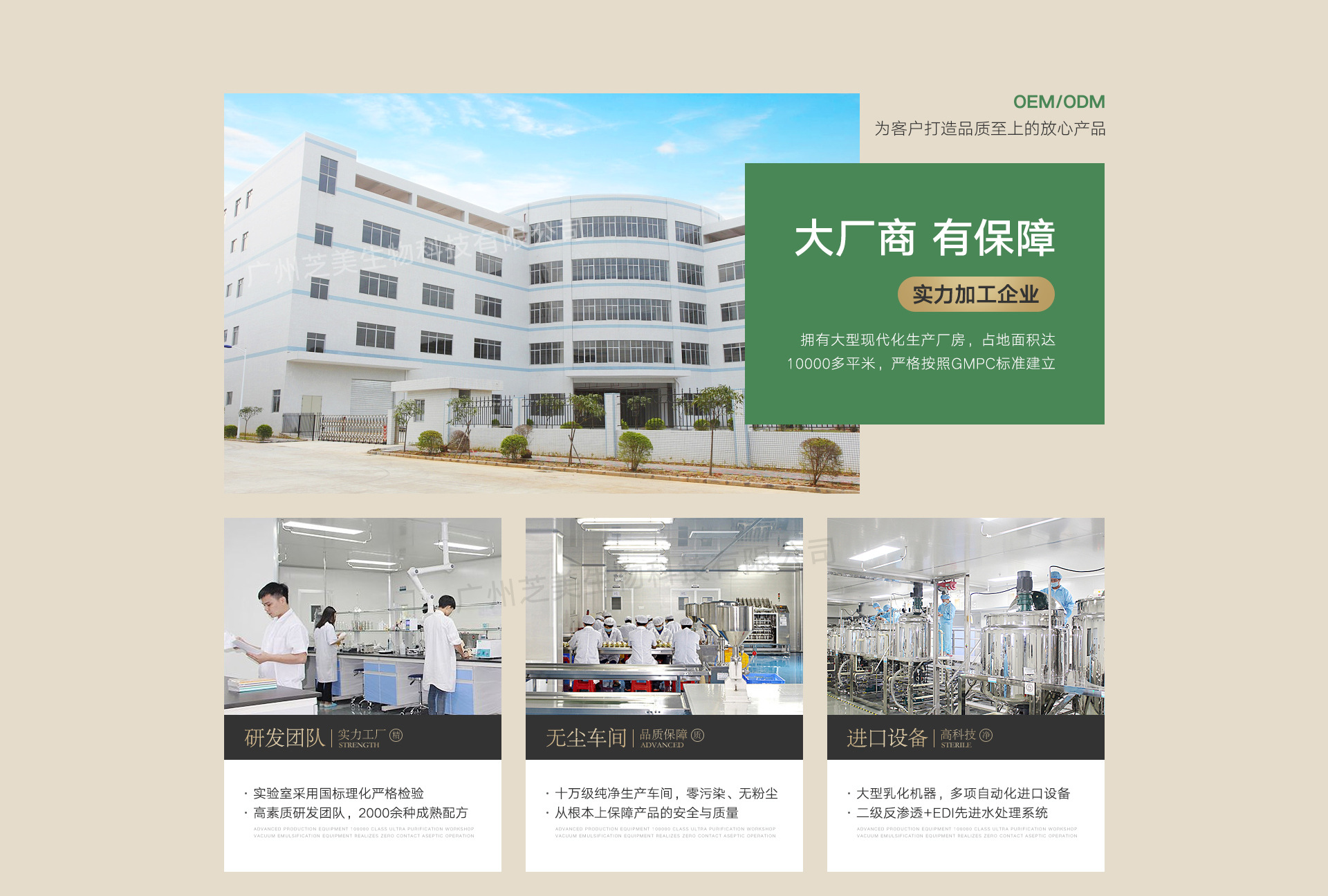 廣州芝美生物科技有限公司,是一家集生產、銷售、研發于一體的化妝品廠,公司占地兩萬平方米,擁有先進的機器設備、醫藥級車間、乳化間以及嚴謹的科研隊伍,我公司研發的多款產品成功的幫客戶打開市場,并在生產銷售中不斷提高產品質量、提升產品品質,成功幫助消費者占領中高市場。我司研發生產的面膜、洗面奶、水乳霜等化妝品及洗發水、沐浴露等日化用品、彩妝暢銷消費者市場,在消費者當中享有較高的地位,公司與多家零售商和代理商建立了長期穩定的合作關系。我司生產、經銷的化妝品、日化用品、彩妝品種齊全、價格合理。兼以我司實力雄厚,重信用、守合同、保證產品質量,以多品種經營特色和薄利多銷的原則,贏得了廣大客戶的信任。歡迎各界朋友蒞臨參觀、指導和業務洽談!