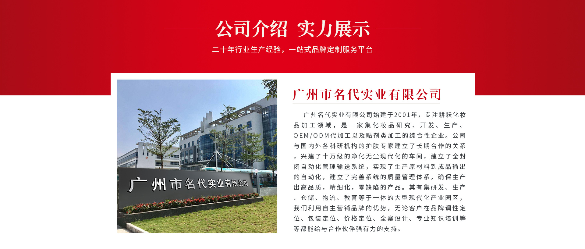 廣州名代實業有限公司始建于2001年是一家專門研發并生產銷售外用貼劑,如足貼和護膚類產品的綜合性企業。 公司與國內外各科研機構的護膚專家建立了長期合作的關系,興建了十萬級的凈化無塵現代化的車間,,建立了全封閉自動化管理輸送系統,實現了生產原材料到成品輸出的自動化,建立了完善系統的質量管理體系,確保生產出高品質,精細化,零缺陷的產品。 十幾年來公司致力于健康養生系列產品開發卓有成效,2004年開發出足貼這一具有劃時代意義的健康產品,迅速占領了屈臣氏、商超、淘寶、阿里、團購組等各大知名實體和電商平臺,開啟了足貼在中國大陸廣發使用的新紀元,旗下貿易公司菲蘭雅詩的品牌“軍之貢”足貼曾在淘寶有上萬家店鋪,09年風靡了整個東南亞市場,在馬來西亞,人人以擁有軍之貢足貼而為時尚。