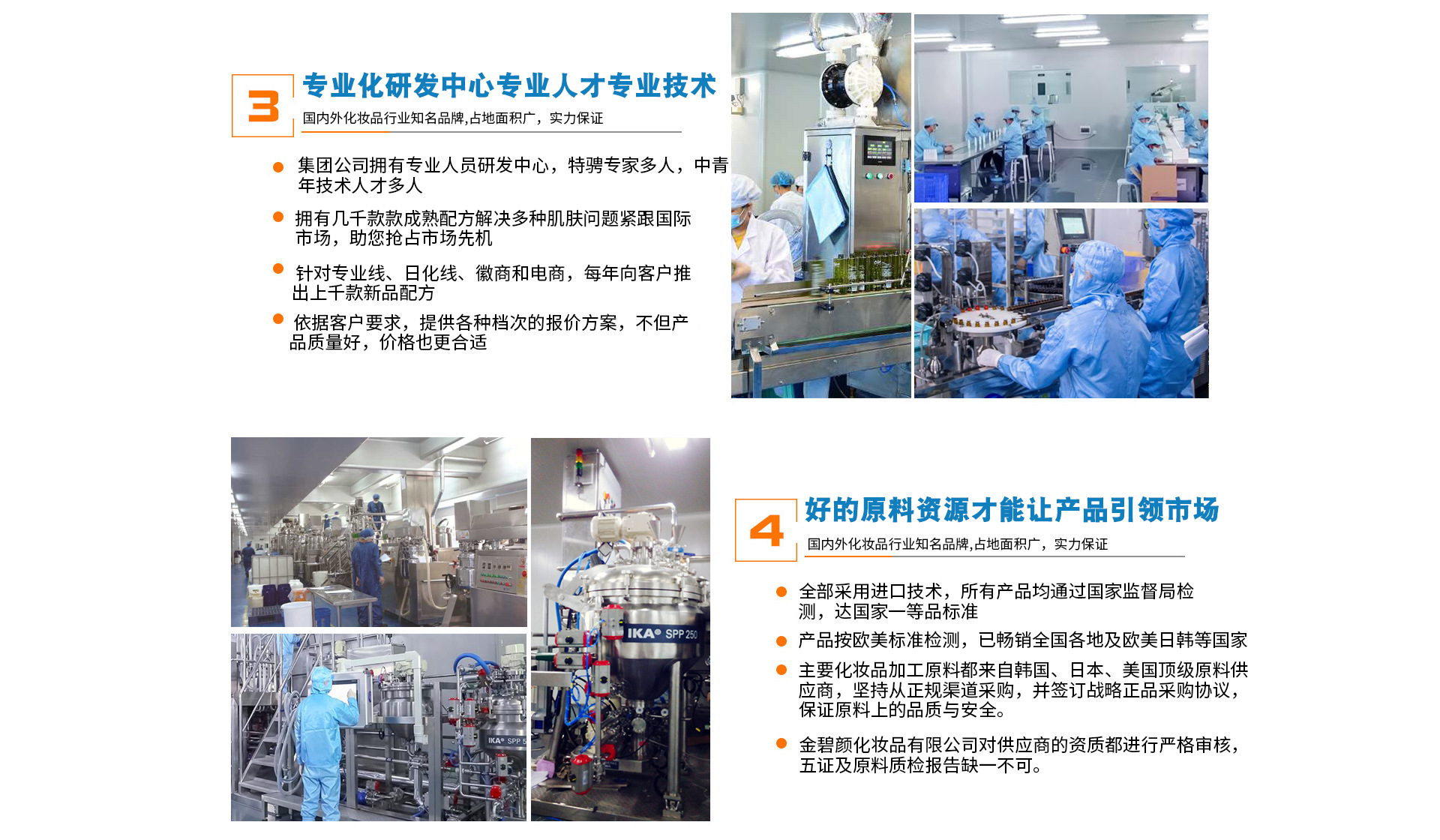 廣州金碧顏化妝品有限公司是中國專業(yè)的化妝品OEM/ODM企業(yè),嚴格按照GMPC標準建立的化妝品生產(chǎn)公司,采用先進的生產(chǎn)技術(shù)和現(xiàn)代化的生產(chǎn)設備,是一家致力于研發(fā)、制造、營銷、服務為一體的綜合型化妝品企業(yè)。公司主打“溫和抗衰,留住青春”的理念,在技術(shù)方面取得顯著研發(fā)成果,工程師將四類抗衰老原料:清除自由基類、細胞修復類、以及保濕類進行組合,公司已經(jīng)具備完整符合要求的抗衰老體系。廣州金碧顏化妝品有限公司的誠信、實力和產(chǎn)品質(zhì)量獲得業(yè)界的認可。歡迎各朋友蓓臨參觀、指導和洽談
