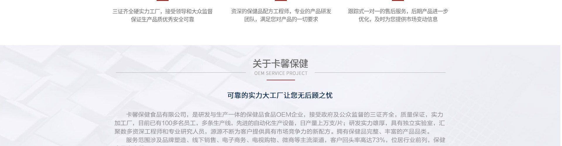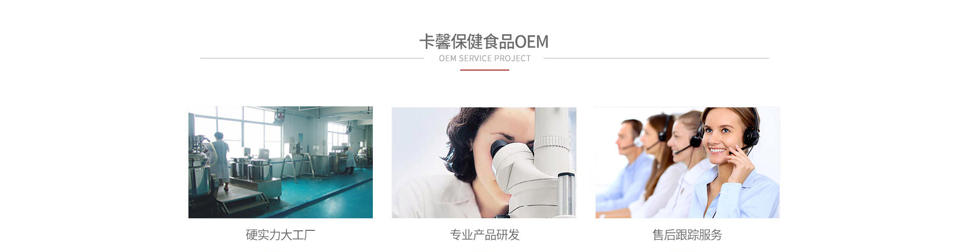 廣州市卡馨保健食品有限公司是一家專注于現代生物健康產品集研發、生產、銷售、服務為一體的綜合性現代化企業; 公司通過了HACCP、ISO2200、認證,具備完整的產品質量控制和保障體系,公司自成立以來,已擁有獨立產品研發實驗室,擁有強大的研發團隊,高級專業技術人才,獲高新技術生產工廠企業。 公司以強大的技術支持平臺、國家規范化管理工廠為依托,并與國內多家集團企業公司等機構達成了長期的技術合作伙伴關系。 我們對外提供OEM一站式服務,主要從事業務范圍是對固體飲料、片劑 壓片糖果、軟硬膠囊、酵素果凍、酵素液體等等系列新產品的開發、生產、包裝、銷售及OEM一條龍服務。廣州市卡馨保健食品有限公司的誠信、實力和產品質量獲得業界的認可。歡迎各界朋友蒞臨參觀、指導和業務洽談。