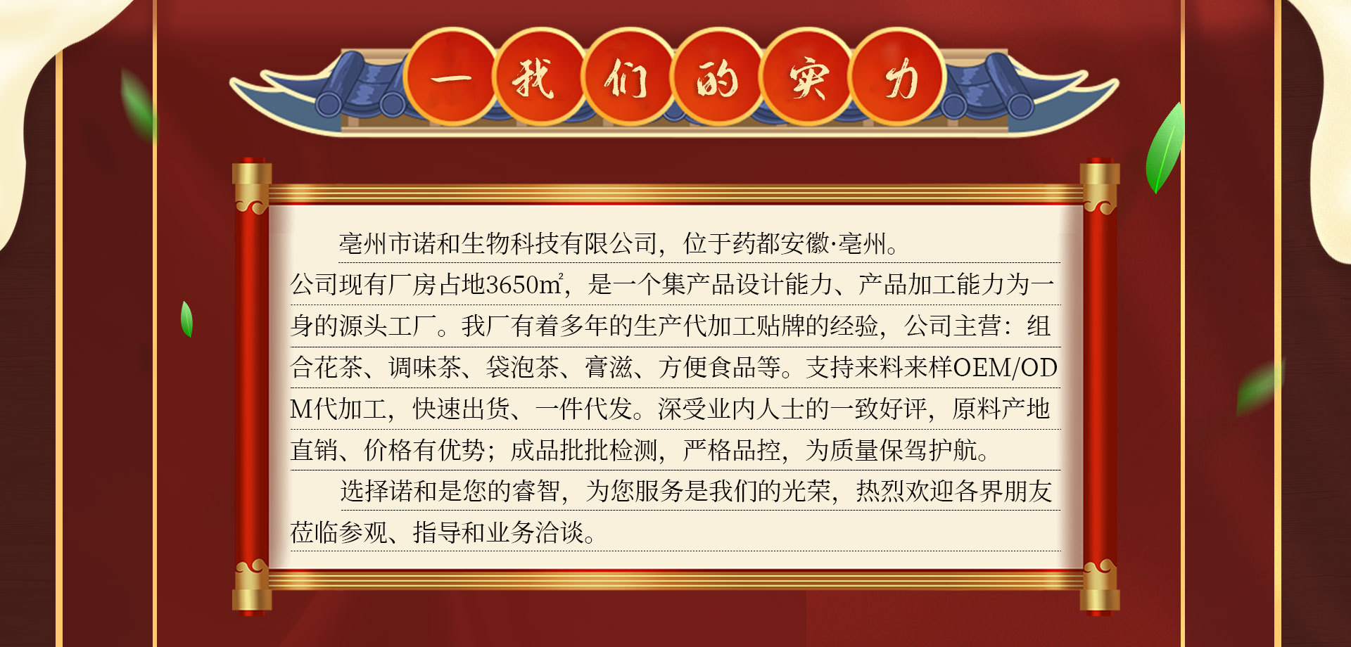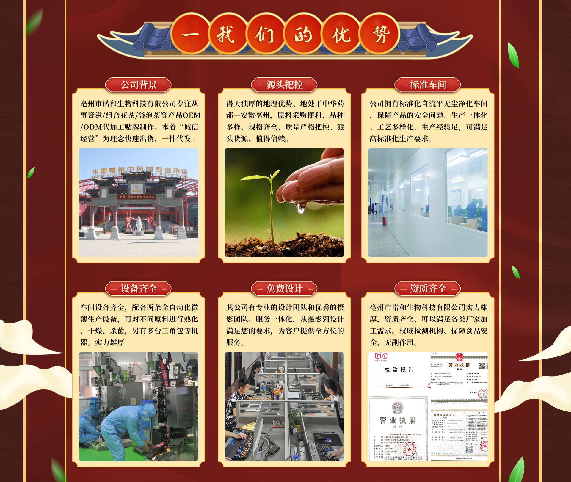 安徽諾和生物科技有限公司是花草茶、花果茶、代泡茶產品專業生產加工的公司,擁有完整、科學的質量管理體系。安徽諾和生物科技有限公司的誠信、實力和產品質量獲得業界的認可。歡迎各界朋友蒞臨參觀、指導和業務洽談。