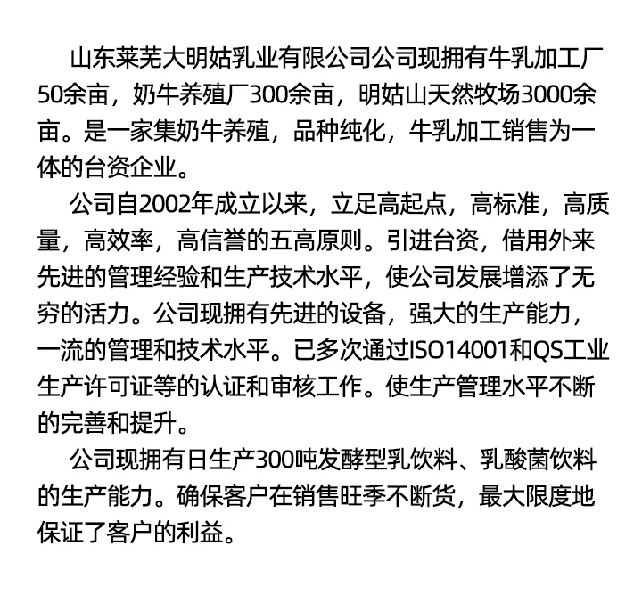 我公司現擁有牛乳加工廠50余畝,奶牛養殖廠300余畝,明姑山天然牧場3000余畝。是一家集奶牛養殖,品種純化,牛乳加工銷售為一體的臺資企業。
