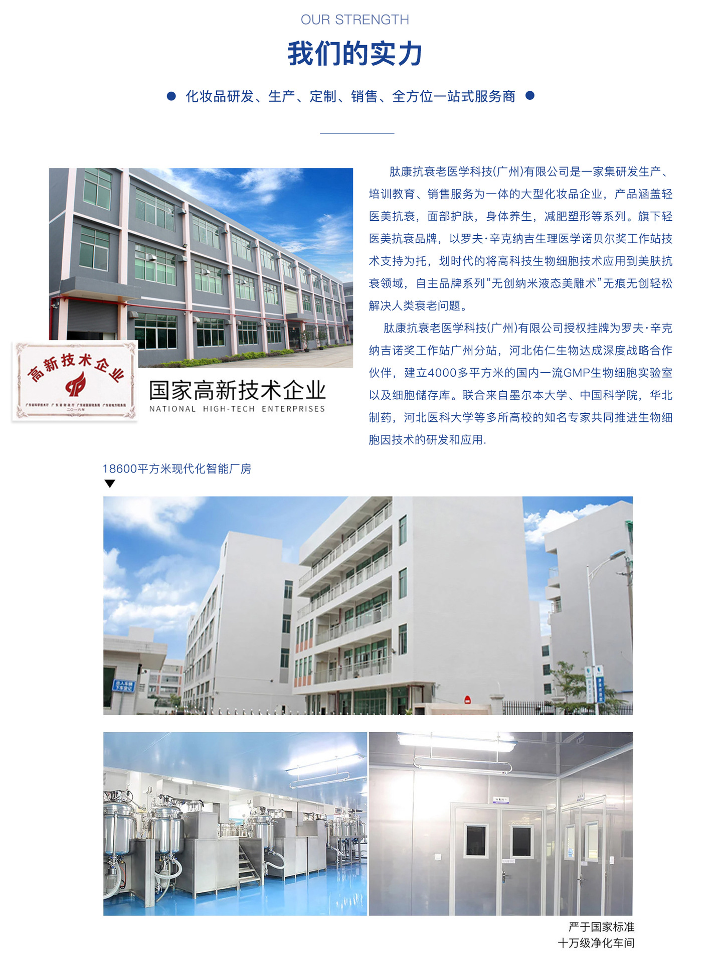 肽康抗衰老醫(yī)學(xué)科技(廣州)有限公司是一家集研發(fā)生產(chǎn)、培訓(xùn)教育、銷售服務(wù)為一體的大型化妝品企業(yè),產(chǎn)品涵蓋輕醫(yī)美抗衰,面部護膚,身體養(yǎng)生,減肥塑形等系列。旗下輕醫(yī)美抗衰品牌,以羅夫·辛克納吉生理醫(yī)學(xué)諾貝爾獎工作站技術(shù)支持為托,劃時代的將高科技生物細(xì)胞技術(shù)應(yīng)用到美膚抗衰領(lǐng)域,自主品牌系列“無創(chuàng)納米液態(tài)美雕術(shù)”無痕無創(chuàng)輕松解決人類衰老問題。 肽康抗衰老醫(yī)學(xué)科技(廣州)有限公司授權(quán)掛牌為羅夫·辛克納吉諾獎工作站廣州分站,河北佑仁生物達(dá)成深度戰(zhàn)略合作伙伴,建立4000多平方米的國內(nèi)一流GMP生物細(xì)胞實驗室以及細(xì)胞儲存庫。聯(lián)合來自墨爾本大學(xué)、中國科學(xué)院,華北制藥,河北醫(yī)科大學(xué)等多所高校的知名專家共同推進生物細(xì)胞因技術(shù)的研發(fā)和應(yīng)用 OEM.ODM 美容護膚品代工的生產(chǎn)廠家