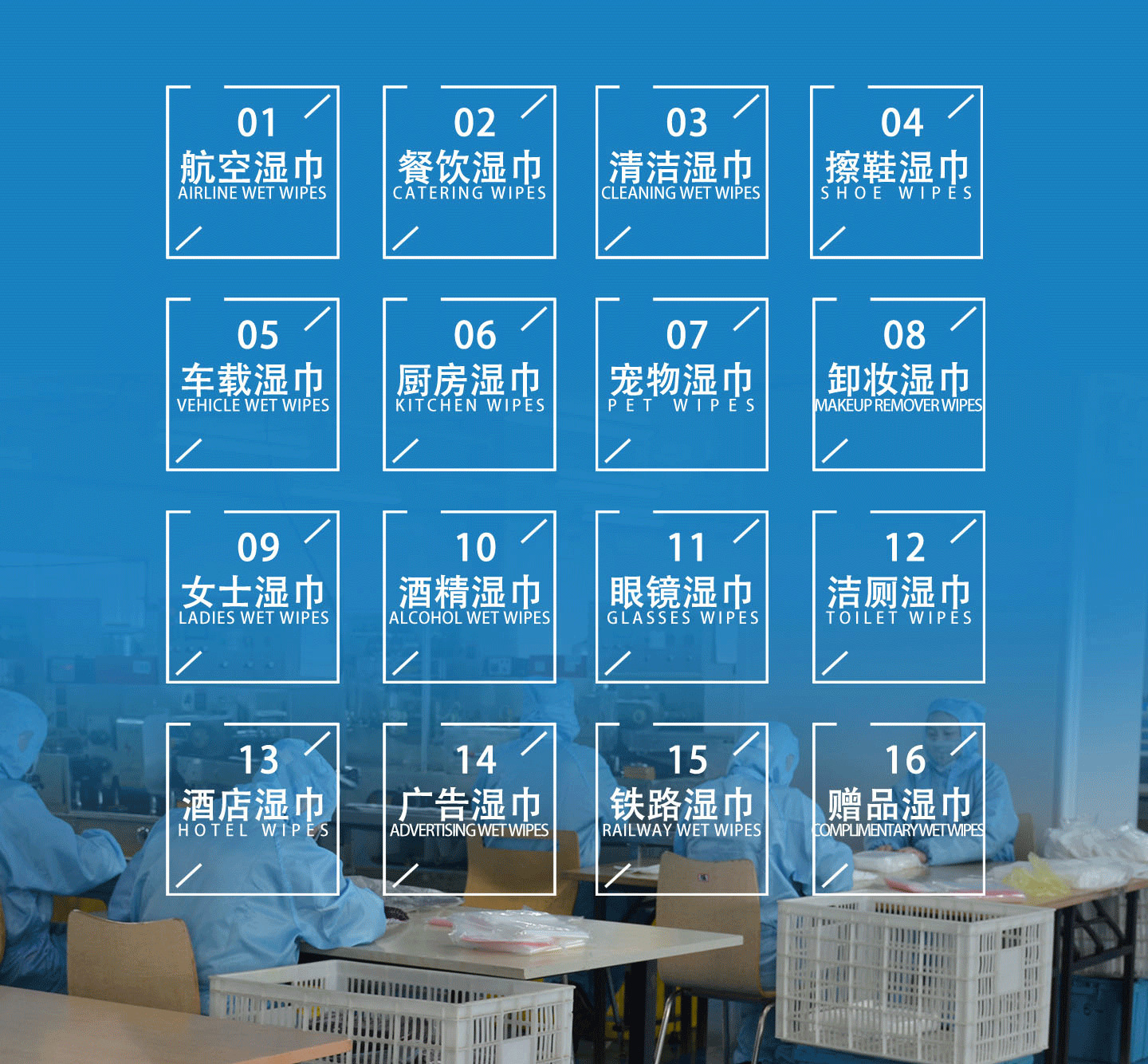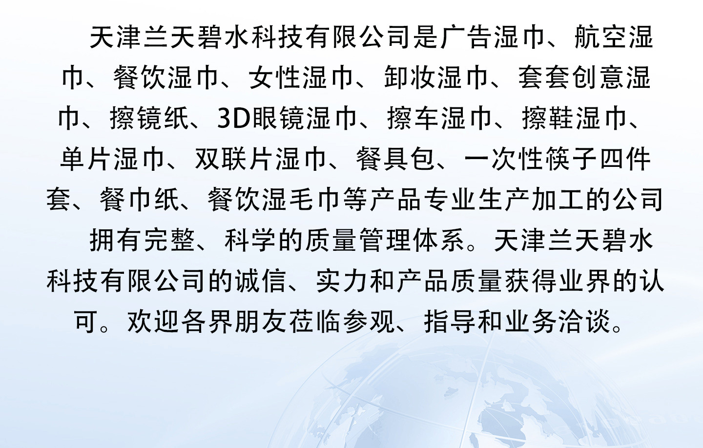 天津蘭天碧水科技有限公司是廣告濕巾、航空濕巾、餐飲濕巾、女性濕巾、卸妝濕巾、套套創意濕巾、擦鏡紙、3D眼鏡濕巾、擦車濕巾、擦鞋濕巾、單片濕巾、雙聯片濕巾、餐具包、一次性筷子四件套、餐巾紙、餐飲濕毛巾等產品專業生產加工的公司,擁有完整、科學的質量管理體系。天津蘭天碧水科技有限公司的誠信、實力和產品質量獲得業界的認可。歡迎各界朋友蒞臨參觀、指導和業務洽談