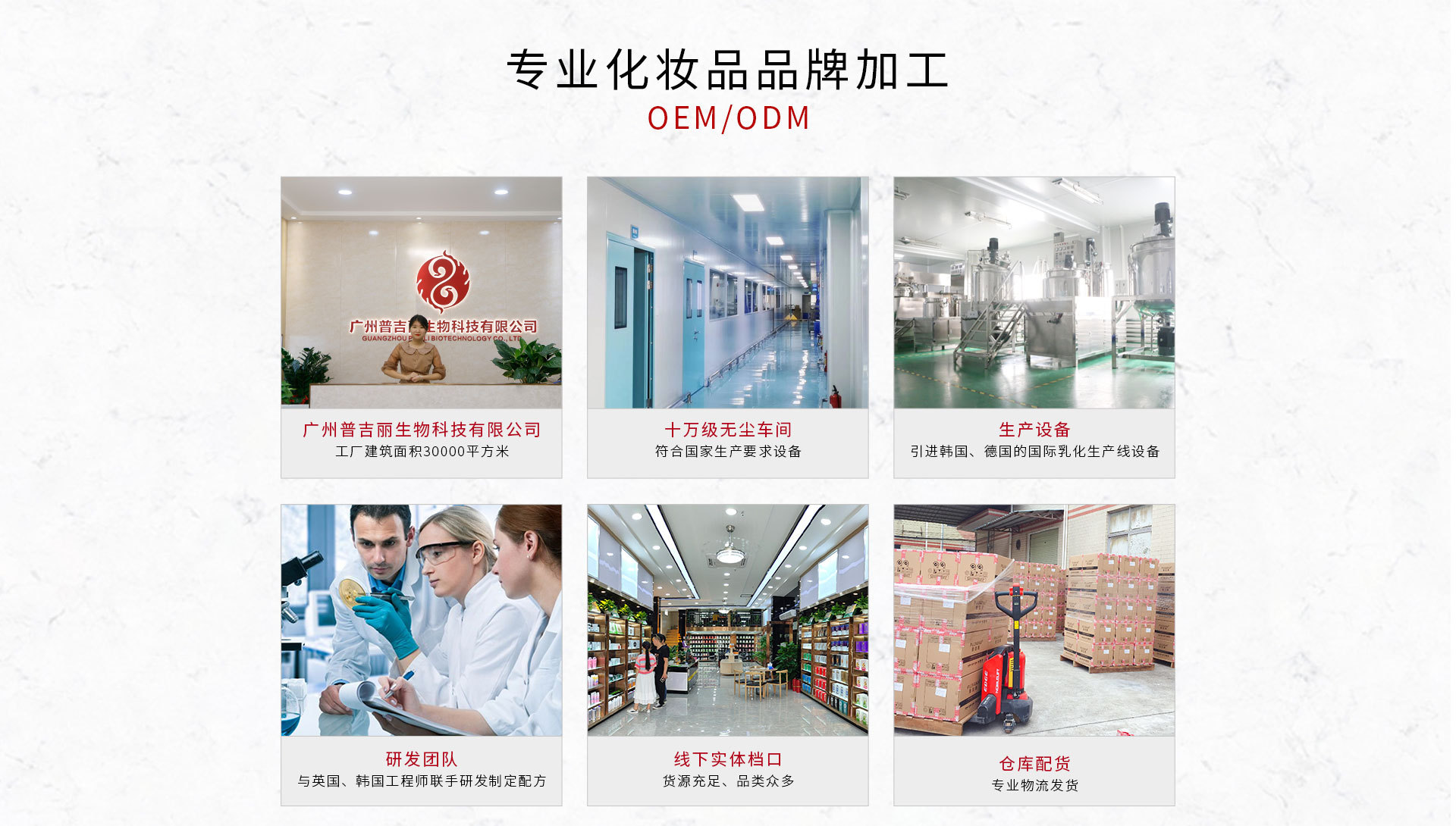 廣州普吉麗生物科技有限公司,是一家自主生產,自主研發團隊,擁有著30000平方的大廠房,跟英國韓國是有密切合作關系,大多數原料都是由國外引進的進口原料,公司可接來料,來圖,來樣,OEM/ODM代加工業務,我們有美白特征,脫毛特征,祛斑特征,械字號等等特殊化妝品證書,也可加工這幾大特殊產品的貼牌加工,本公司擁有著九大自主品牌,上官氏,碧玉堂,普伽娜,希絲戀,后植秀,渲婷,紅姿,瑾漾,菲曼芝。