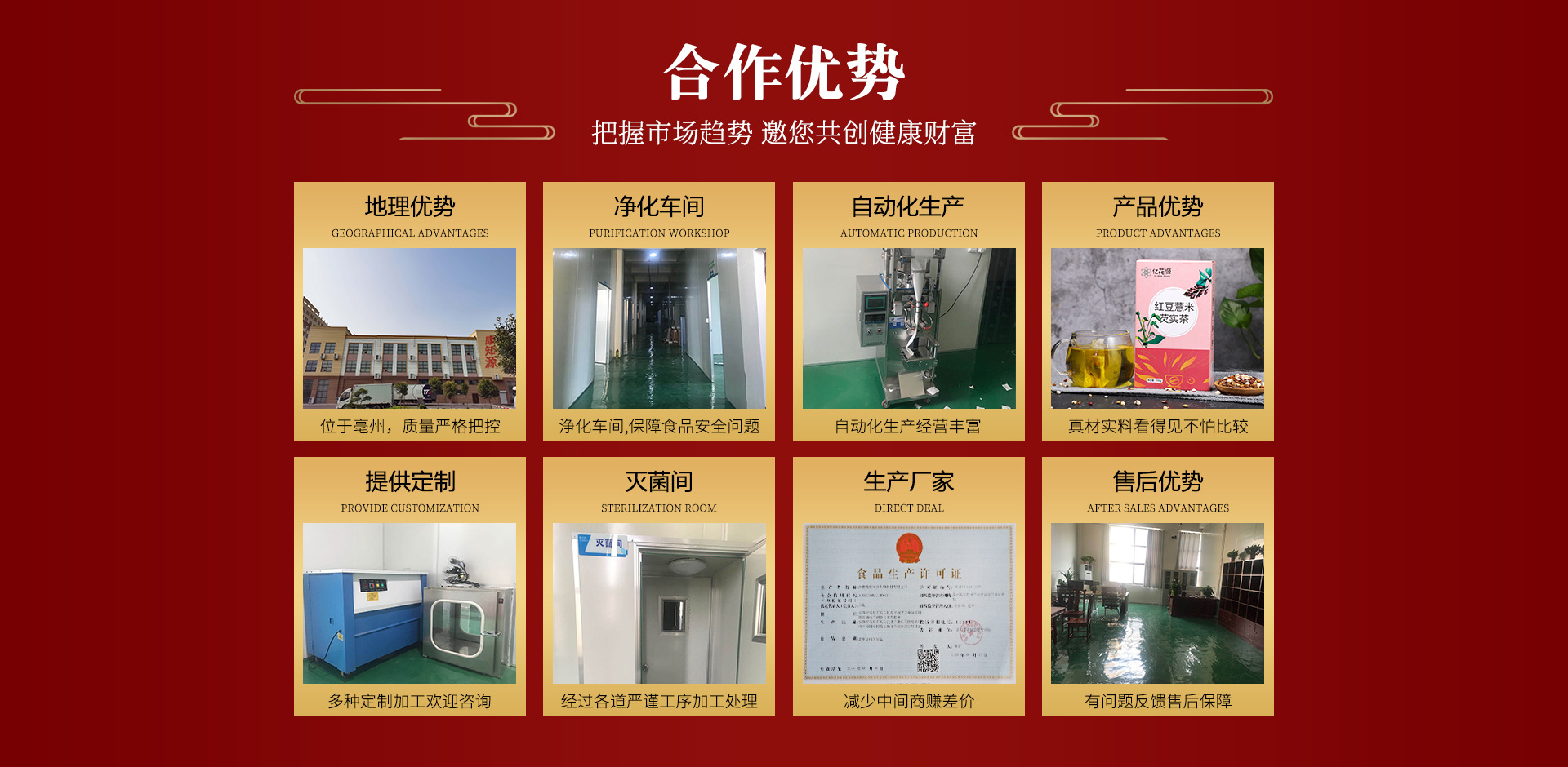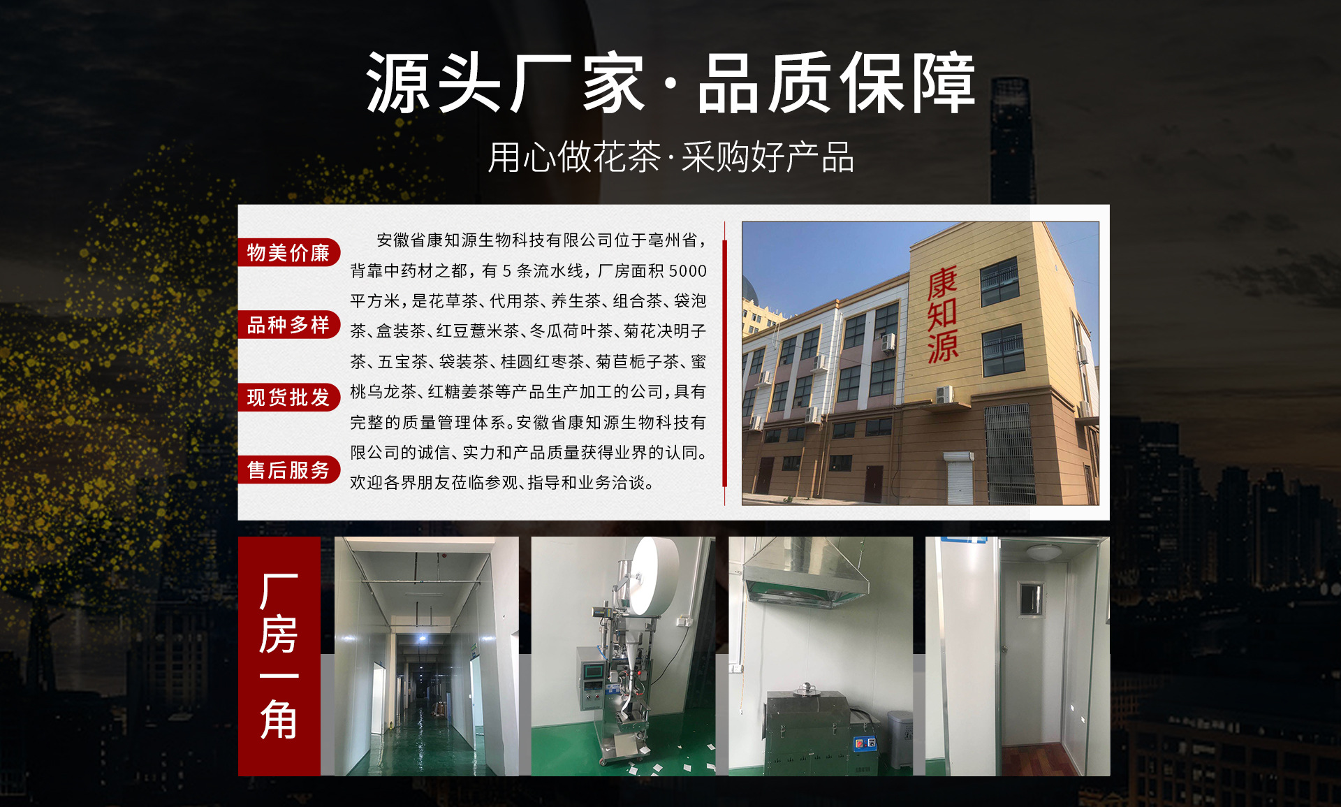 安徽省康知源生物科技有限公司是花草茶、代用茶、養生茶、組合茶、袋泡茶、盒裝茶、紅豆薏米茶、冬瓜荷葉茶、菊花決明子茶、五寶茶、袋裝茶、桂圓紅棗茶、菊苣梔子茶、蜜桃烏龍茶、紅糖姜茶等產品專業生產加工的公司,擁有完整、科學的質量管理體系。安徽省康知源生物科技有限公司的誠信、實力和產品質量獲得業界的認可。歡迎各界朋友蒞臨參觀、指導和業務洽談。