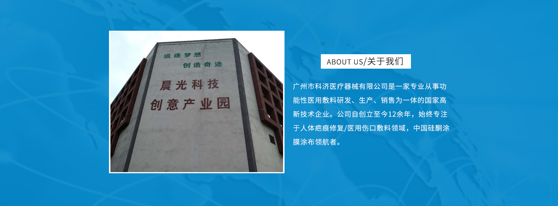 廣州市科濟醫療器械有限公司是一家專業從事功能性醫用敷料研發、生產、銷售為一體的國家高新技術企業。公司自創立至今12余年,始終專注于人體修復、人體皮膚修復、醫用傷口敷料領域?;诳蛻粜枨蟪掷m創新,不斷加強新技術研發和新材料應用,現已成為國內疤痕防治領域領航企業,國內皮膚創面修復護理整體方案供應商。我司生產基地位于廣州經濟技術開發區(西區),擁有符合SFDA標準以及ISO要求的品控體系。自2004年建立實驗室伊始,長期堅持研發投入,全系產品擁有完全自主知識產權,主要產品覆蓋全國80%的區縣以上醫療機構及醫保醫藥連鎖機構。 科濟人堅持走品牌化道路,以市場需求為導向,加強技術革新,嚴控品質監管;本著專注研發、助力醫療的企業宗旨,不忘初心,造福于民 ..