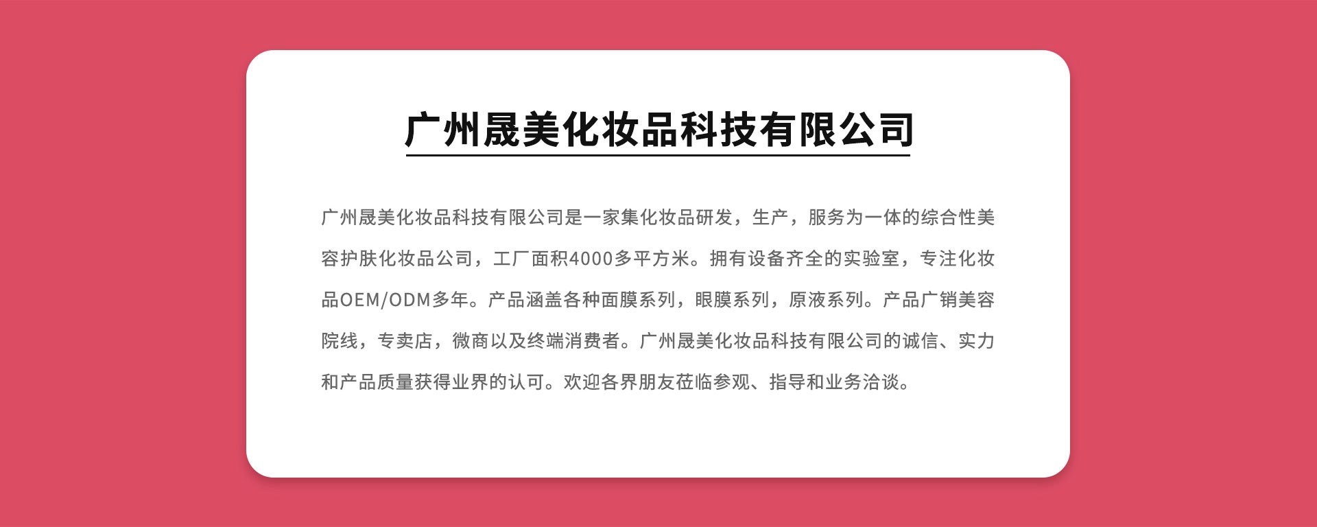 廣州晟美化妝品科技有限公司是一家主營(yíng)護(hù)膚品生產(chǎn)眼膜面膜生產(chǎn),專業(yè)化妝品OEM/ODM,是一家綜合性美容護(hù)膚化妝品公司,工廠面積4000多平方米。擁有設(shè)備齊全的實(shí)驗(yàn)室,專注化妝品OEM/ODM多年。產(chǎn)品涵蓋各種面膜系列,眼膜系列,原液系列。產(chǎn)品廣銷美容院線,專賣店,微商以及終端消費(fèi)者。廣州晟美化妝品科技有限公司的誠(chéng)信、實(shí)力和產(chǎn)品質(zhì)量獲得業(yè)界的認(rèn)可。歡迎各界朋友蒞臨參觀、指導(dǎo)和業(yè)務(wù)洽談。