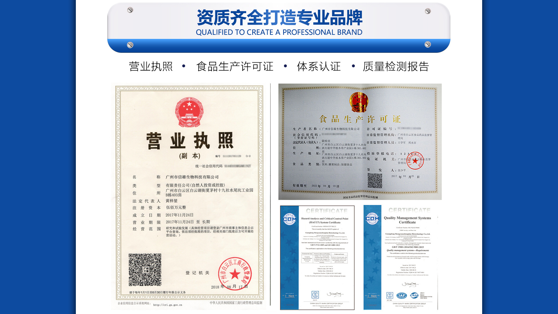 廣州信雄生物科技有限公司是一家集研發,制造,銷售,服務以及大健康文化傳播于一體的專業OEM/ODM高新科技綜合性企業,是專業實效加工領航者,公司提供固體飲料,壓片糖果,膠原蛋白,酵素,代餐,牡蠣,瑪咖等待的保健營養食品加工及成品,同時可為客戶提供OEM定制的多元成份保健食品,我司全心全意為幫助品牌實現省心,省力,省錢服務。