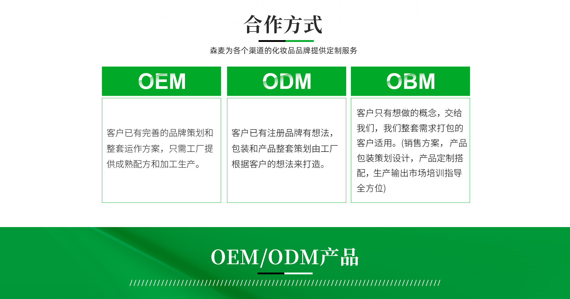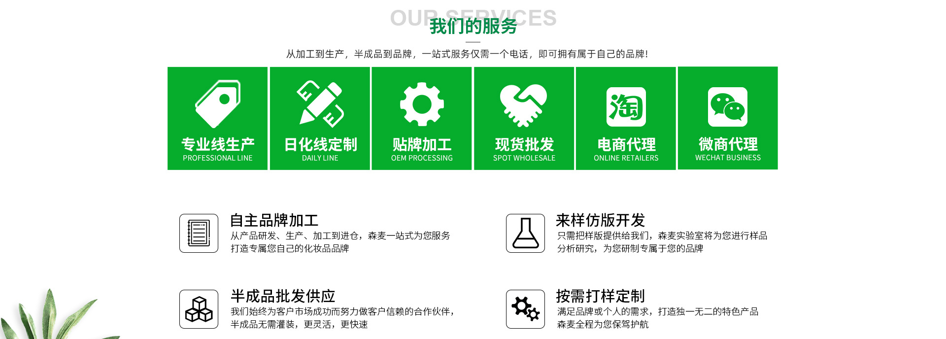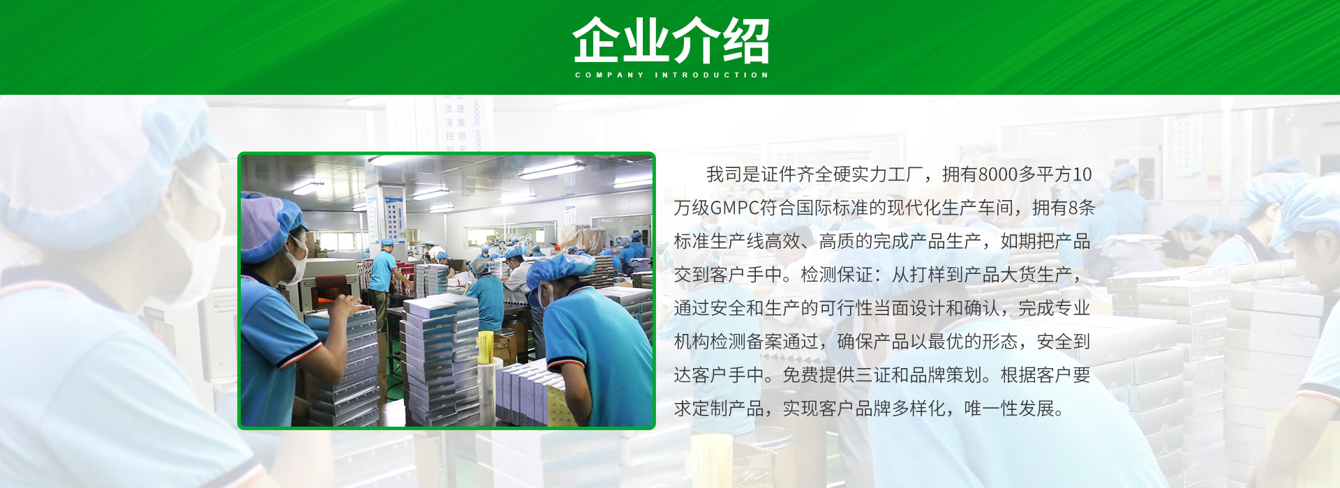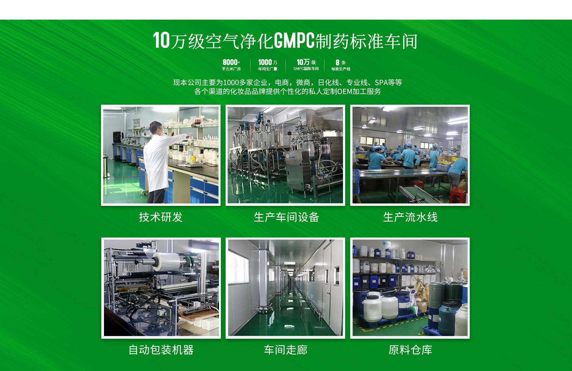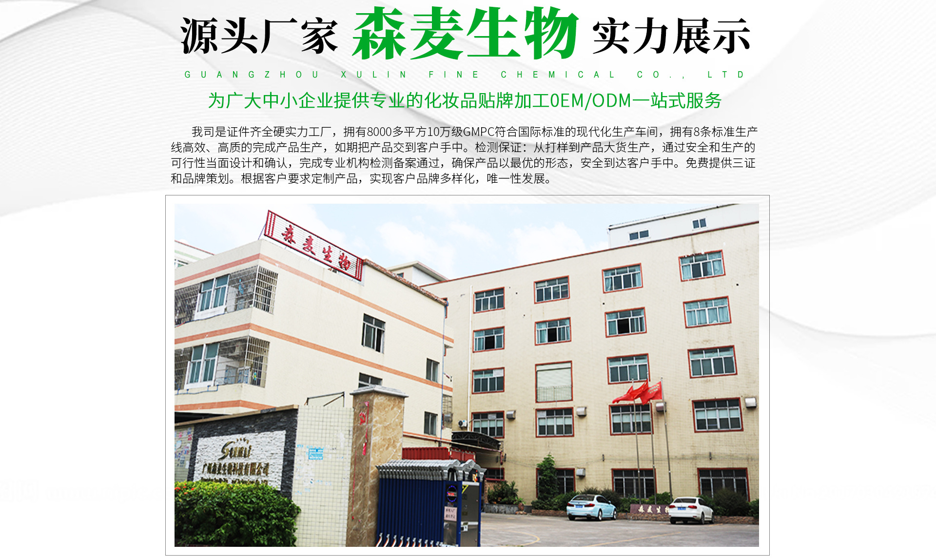 森麥化妝品加工廠憑借優(yōu)質(zhì)的產(chǎn)品,卓越的功效、專業(yè)的服務(wù)水準(zhǔn),在行業(yè)內(nèi)贏得國內(nèi)客戶的普遍尊重。公司已經(jīng)與多家國內(nèi)數(shù)十家知名專業(yè)、日化企業(yè)建立了合作關(guān)系,是業(yè)界功效型產(chǎn)品:祛皺祛斑祛痘美白、面膜、貼片系列專業(yè)的OEM/ODM專業(yè)服務(wù)企業(yè)之一。     擁有8000多平方10萬級GMPC符合國際標(biāo)準(zhǔn)的現(xiàn)代化生產(chǎn)車間.具備孕童產(chǎn)品和眼部特護生產(chǎn)資質(zhì),公司以優(yōu)異的產(chǎn)品質(zhì)量、簡捷明快的產(chǎn)品形象深受消費者喜愛,特別是其產(chǎn)品結(jié)構(gòu)豐富,產(chǎn)品使用效果獨特,并以其獨特的設(shè)計風(fēng)格,深受消費者熱捧,并受到國際化妝品界的高度關(guān)注,公司與國內(nèi)企業(yè)強強結(jié)合,共同投資研發(fā)、共同享受科技成果,確保公司產(chǎn)品、快速、安全,質(zhì)量達(dá)到國際先進水平。     產(chǎn)品加工和服務(wù)項目:美白、祛斑、祛痘、祛皺及水晶膜貼系列、無紡布面膜系列、養(yǎng)生和其它貼系列。產(chǎn)品從質(zhì)量、款式均在同行之首,而且手續(xù)齊全。開發(fā)能力強,技術(shù)成熟,產(chǎn)品品種款式多樣,面