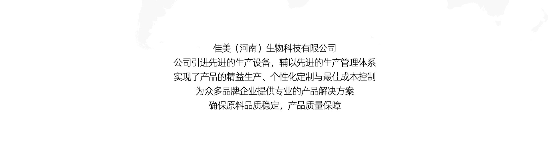 河南佳美生物有限公司主營保健產品、消毒品的研制開發、生產與銷售,公司秉承質量至上、信譽第一的經營宗旨,堅持科技發展、以人為本的原則,不斷推出高科技的產品奉獻給消費者。 公司占地面積一萬余平方米,車間總面積3300平方米,現代的標準化生產車間已通過國家質量體系認證,配有先進的制造設備和精密的檢驗儀器。本公司連年被評為“消費者公認優質產品”、““保護消費者權益優質信譽品牌”、“重合同守信譽企業”。 佳美生物,健康使者,希望象征。 “ 以人為本 ”是佳美的理念; “ 筑巢引鳳 ”是佳美的戰略; “ 品質卓越 ”是佳美的追求; “ 風險我擔、利益共享、優勢互補、共同發展 ”是佳美的宏愿。
