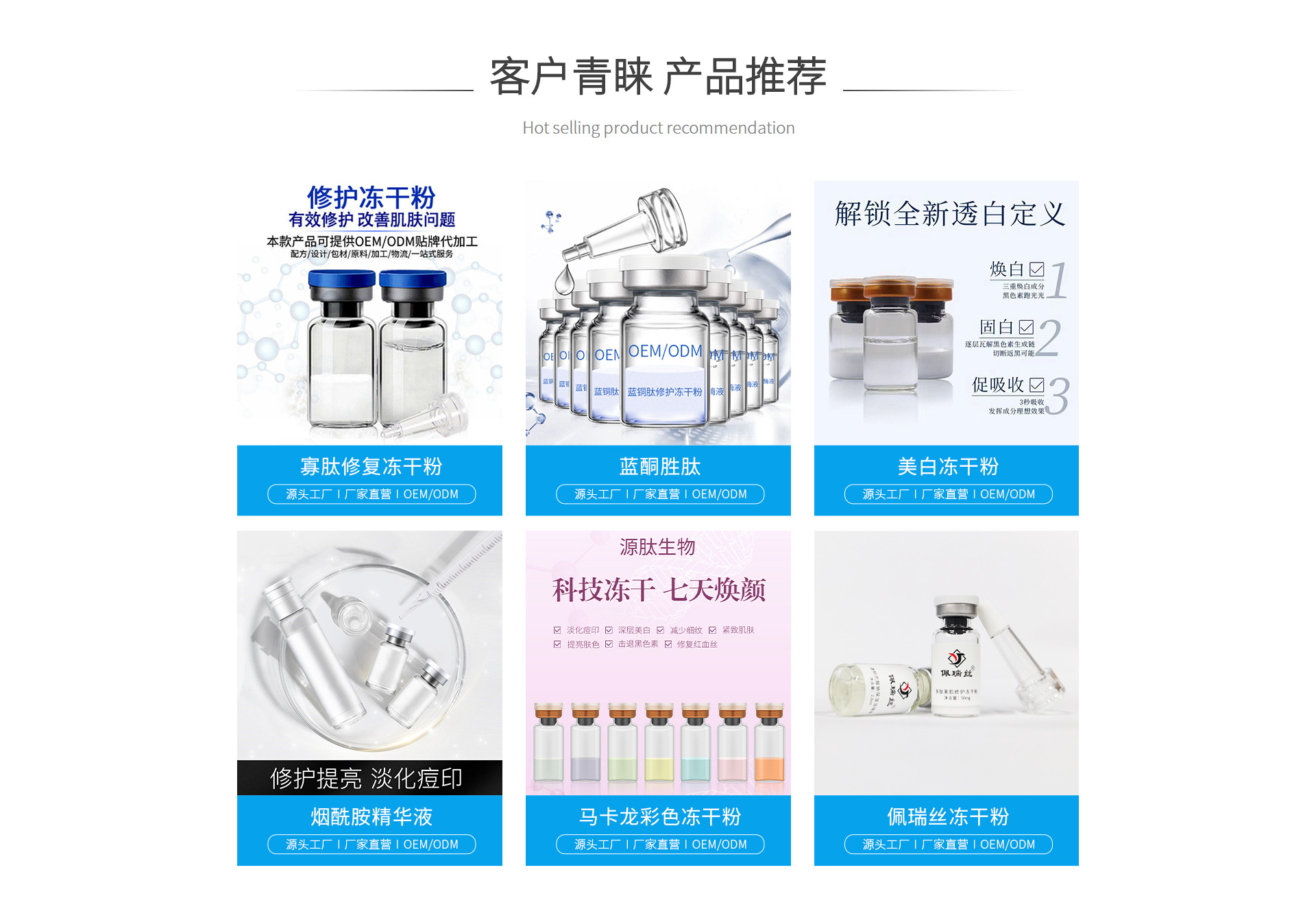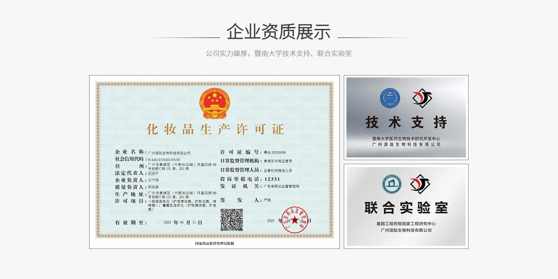 廣州源肽生物科技有限公司是一家集研發(fā)、開(kāi)發(fā)、生產(chǎn)、銷(xiāo)售、貿(mào)易、服務(wù)于一體的新型專業(yè)化妝品OEM/ODM高科技企業(yè),坐落于廣州中新知識(shí)城匯霖科技園。     公司專注于綠色化妝品、高端個(gè)護(hù)健康產(chǎn)品的研發(fā)、生產(chǎn)和技術(shù)服務(wù)。公司擁有專業(yè)的研發(fā)團(tuán)隊(duì),依托暨南大學(xué)醫(yī)藥生物研究技術(shù)開(kāi)發(fā)中心和基因工程藥物國(guó)家工程研究中心的技術(shù)支持,目前團(tuán)隊(duì)已獲多種研發(fā)技術(shù)。