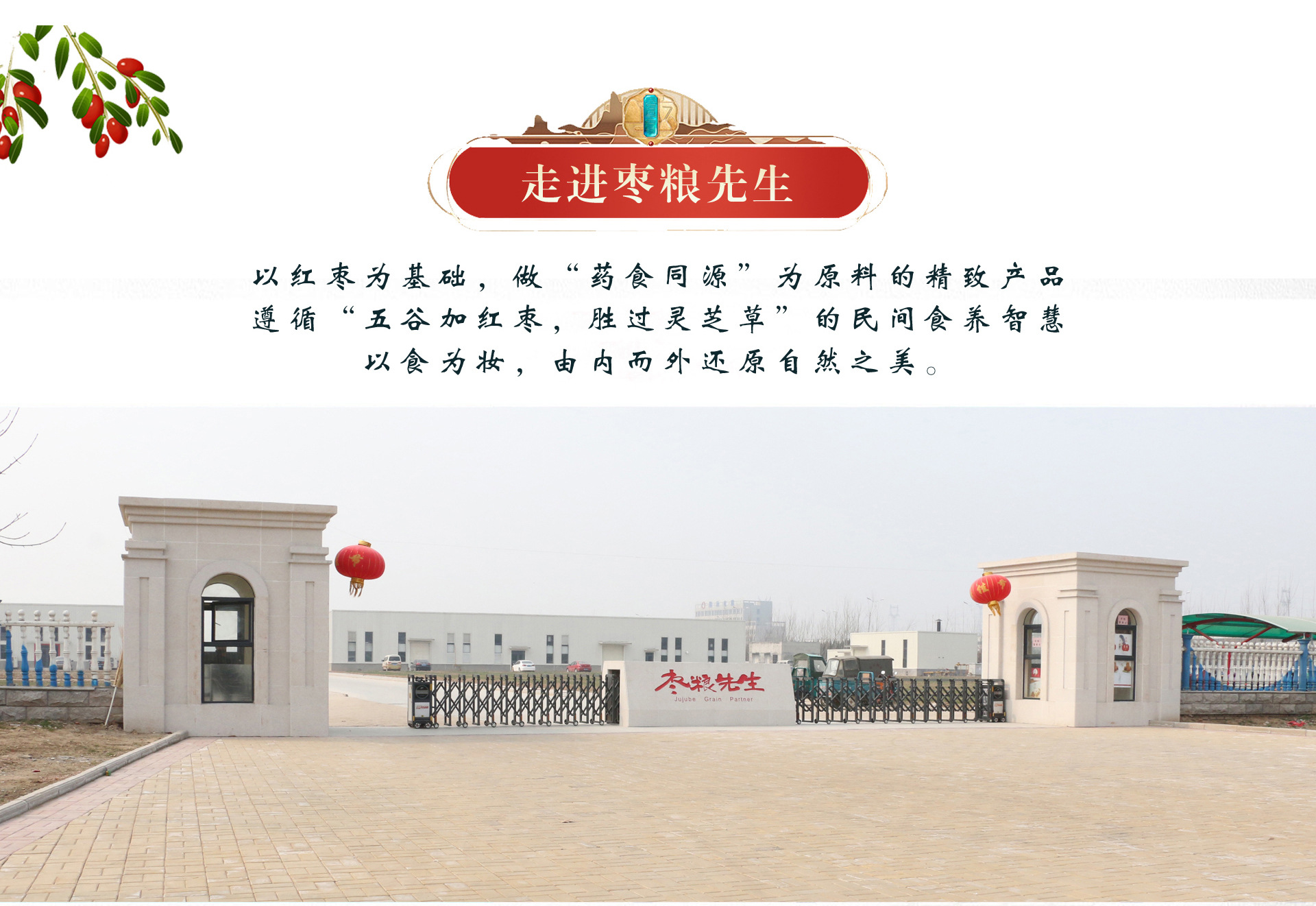 山東棗糧先生生物科技有限公司是一家以“精致”為原則,以紅棗為基礎,做“藥食同源”為原料的,全產業鏈的,互聯網型,小而美的股份制企業。 公司始建于2015年1月,依托德州市百萬畝棗林資源,以及上千年的紅棗文化,以工業產業、農業產業、互聯網產業和文化產業四大板塊為核心,規劃建設了現代棗制品加工中心、立體農業(新疆和陵城區)、養生文化園、互聯網運營平臺四大產業,其中現代化食品加工中心、養生文化園、互聯網運營平臺等產業板塊正在籌建中。 作為中國食品行業的引領者,棗糧先生以“做精致的企業,做精致的人”為愿景,以市場需求為導向,以互聯網的思維模式,致力于把公司打造成為中國健康零食領航品牌,公司立足紅棗,配伍小麥、玉米、核桃、花生、山楂等谷物,依據藥食同源的理論,結合中醫中草藥文化,創造性的提出“食妝”這一消費理念,運用以“食材護膚,以食為妝”,以內養外的食療、食治、食補、食調的理念。