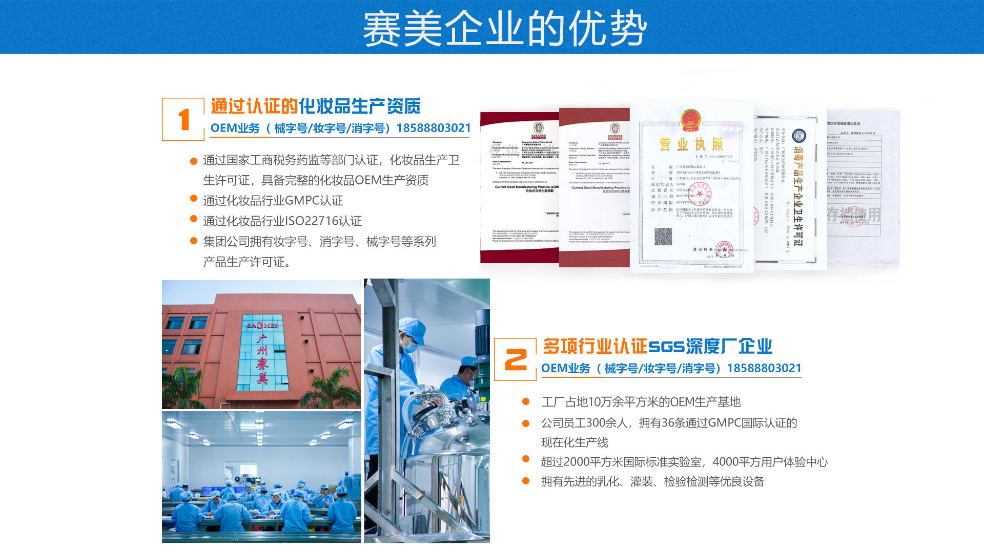 賽美是一家兩證合一,集妝、消、食、械四大字號于一體,提供研制開發、生產銷售、技術服務、包裝設計、專業品牌服務為一體的大型現代化企業,以“科研、專注、體驗、服務”為經營理念。專注專業消毒、凈化、抑菌這三類產品優化與生產。精湛的技術,一站式服務,公司設在廣州市白云區 ,專注于產品加工,集研制開發、生產銷售、技術服務、包裝設計、專業品牌為一體的大型現代化企業,用實力和口碑贏得市場。自創立以來,賽美一直秉承“以質量塑造品牌,以品牌贏得市場”的企業經營理念,始終堅持以眾多女性健康需求為出發點,以產品品質為根本,時刻把握國際化發展潮流方向,積極創新,至今掌握2000多種配方,研制完成的產品,不僅涵蓋日常女性私密護理,排毒、凈化、抑菌、婦科凝膠,更己拓展至消毒,止癢、殺菌、抑菌外用消毒類型產品,口腔護理類型等優秀產品。目前,賽美在成功運營自主品牌的基礎上,更為百個合作伙伴提供專業生產加工,將其品牌順利推