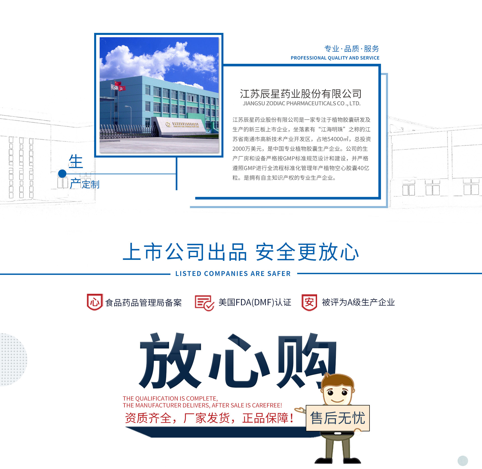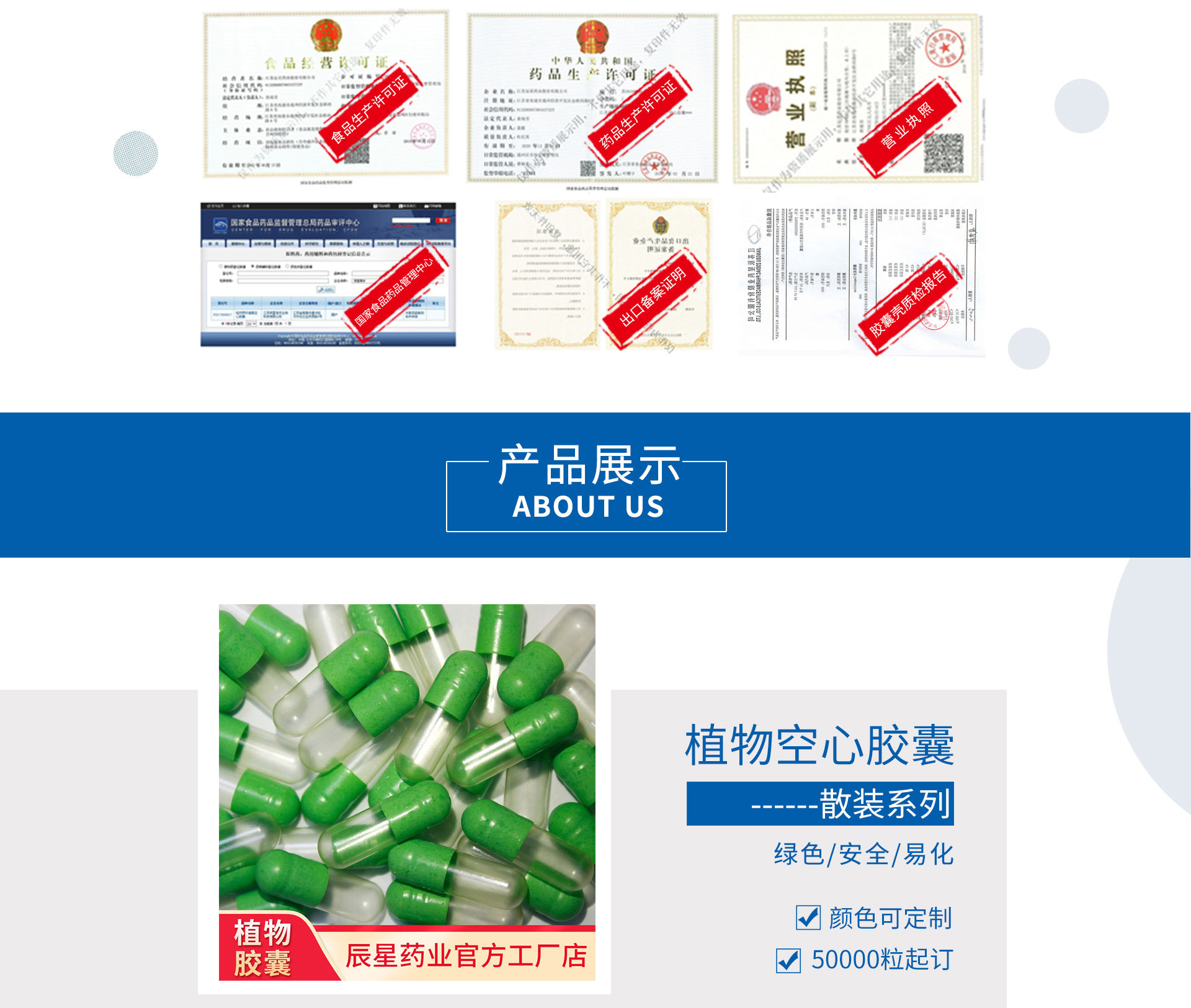 江蘇辰星藥業股份有限公司是一家專注于植物膠囊研發及生產的新三板掛牌企業(股票代碼:839738),位于江蘇省南通市通州區國家高新技術產業開發區,占地54000㎡,總投資2000萬美元,是中國專業植物膠囊生產企業。公司的生產廠房和設備嚴格按GMP標準規范設計和建設,并嚴格遵照GMP進行全流程標準化管理,年產植物空心膠囊40億粒。是擁有自主知識產權的專業生產企業。 公司主要研發植物復合膠,通過先進的工藝手段加工成植物空心膠囊,該研發項目獲得國家發明專利證書。產品可以適應于市場上的各類填充機,各項指標與美國、日本的同類產品不相上下,具有植物空心膠囊的完全自主知識產權。2019年,該產品已完成國家藥監局原輔包平臺登記注冊,登記號為F20170000017,并已通過相關技術審評,現狀態為【A】