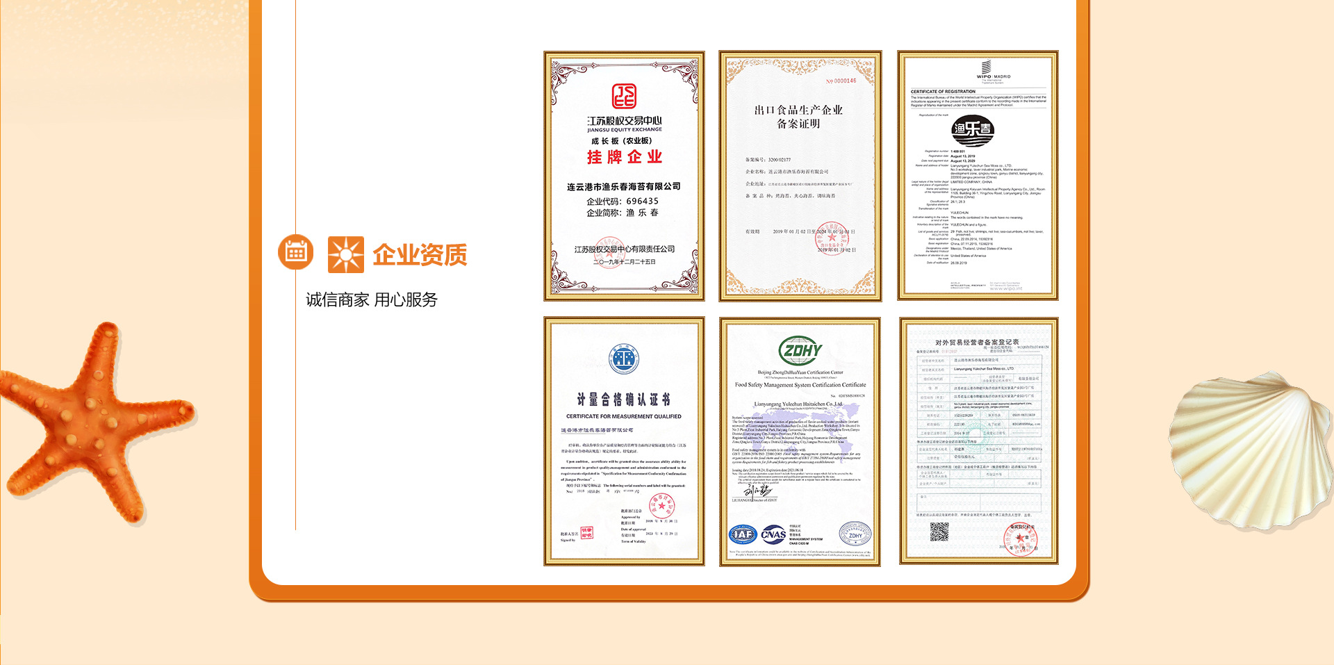 連云港市漁樂春海苔有限公司坐落于江蘇省贛榆海洋經濟開發區,位于縣城東部,東臨黃海,西臨長深、沈海高速和204、310國道,距連云港港30分鐘車程,距青島2小時車程,地理位置得天獨厚,交通便捷。 公司占地面積7000平方米,現有職工70余人,其中多名中高級技術人才。現有二次加工生產烤線2套及烘干機、切片機、包裝機等先進生產設備。生產車間采用信息化管理,生產流程嚴格按照 Haccp規范要求生產。公司擁有“有機食品基地”秦山島沿海無污染海苔養殖水面2000余畝,年產原藻800余噸,可加工干海苔3000萬張,并可根據客戶要求提供片裝海苔和其他各規格的海苔產品。公司技術部采用日、韓流行加工工藝和口味生產,目前已形成壽司海苔、調味海苔、海苔絲、炭燒海苔(肉松、芝麻、芥末海苔)四大系列主產品,成為國內眾多食品加工企業的首選海苔原料供應商。公司旗下“漁樂春”、“呵呵仙”、“金柳”牌系列海苔產品深受消費者青