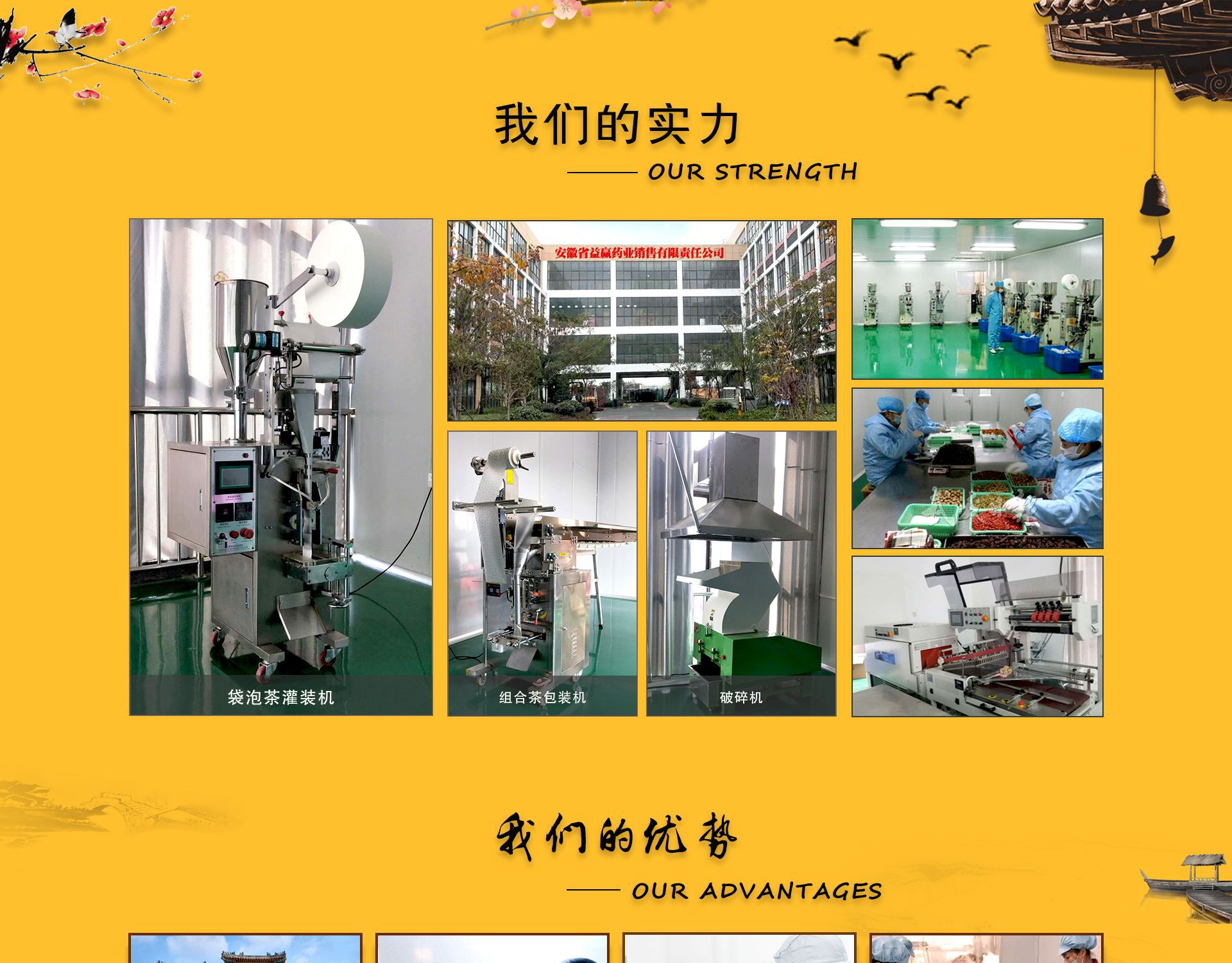 安徽省益贏藥業銷售有限公司,坐落于亳州市經濟開發區文采路雙創產業園,本公司生產車間4000多平方米,是一家集科研、生產、銷售于一體的現代化生產企業,自公司成立以來發展迅速,業務不斷提升。 本公司主要生產經營:代用茶、調味茶、方便食品、代餐粉、固體飲料等各種水果茶,OEM貼牌代加工,誠招全國電商、微商、實體店前來加盟。我公司本著“益于生命,贏在健康。”的經營理念取得了多家企業信任和支持,建立了長期穩定的合作關系。 熱烈歡迎各位新老客戶來我公司參觀、考察,洽談業務,真誠的期待與您合作