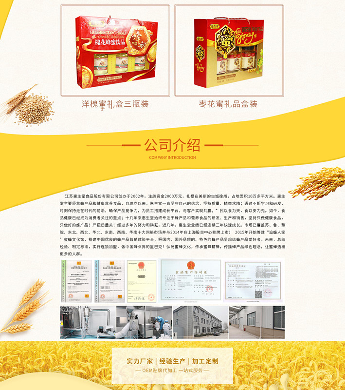 江蘇惠生堂食品股份有限公司創(chuàng)辦于2002年,注冊(cè)資金2100萬(wàn)元,位于國(guó)家歷史名城-徐州,占地面積1萬(wàn)余平方米。公司擁有商標(biāo)品牌及專利技術(shù)近百項(xiàng),是一家專業(yè)生產(chǎn)、經(jīng)營(yíng)蜂產(chǎn)品、雜糧方便食品、黑芝麻糊、豆奶粉、系列營(yíng)養(yǎng)麥片、藥食同源產(chǎn)品等健康營(yíng)養(yǎng)食品的公司。 公司自成立以來,一直堅(jiān)守“質(zhì)量第一、精益求精”的工匠精神,生產(chǎn)車間為10萬(wàn)級(jí)GMP凈化車間,并在當(dāng)?shù)芈氏刃袠I(yè)通過了ISO9001:2015國(guó)際質(zhì)量管理體系認(rèn)證、IOS22000:2005食品管理體系認(rèn)證。并被認(rèn)定為省民營(yíng)科技型企業(yè)、省科技型中小企業(yè)、市知名商標(biāo)、市級(jí)農(nóng)業(yè)產(chǎn)業(yè)化龍頭企業(yè)、區(qū)級(jí)、市級(jí)電商示范企業(yè)、市藥食同源工程技術(shù)中心等稱號(hào)! 近二十年來,惠生堂始終致力于蜂產(chǎn)品、營(yíng)養(yǎng)食品的研發(fā)、生產(chǎn)和銷售,嚴(yán)把原材料源頭關(guān)、嚴(yán)把產(chǎn)品質(zhì)量關(guān)!蜂產(chǎn)品堅(jiān)持蜜源地建廠,只做高品質(zhì)蜂產(chǎn)品!堅(jiān)持只做健康食品!經(jīng)過多年的努力和耕耘,產(chǎn)品已覆蓋主要省份。
