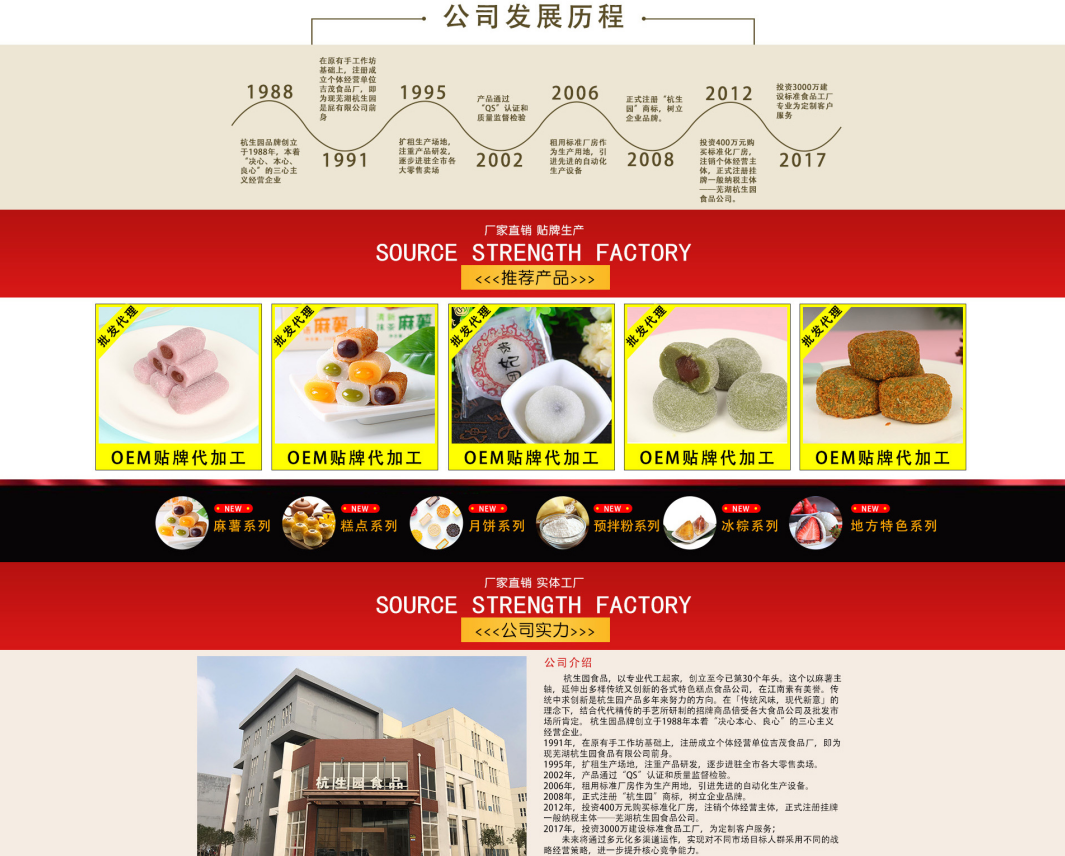蕪湖杭生園食品有限公司是糕團、青團、麻薯、綠豆糕、烘糕、月餅、酥糖、云片糕、玉帶糕、原料等產品專業生產加工的公司,擁有完整、科學的質量管理體系。蕪湖杭生園食品有限公司的誠信、實力和產品質量獲得業界的認可。公司多年來,通過全體員工的不懈努力,以及各地經銷商的支持與配合,公司的業務得以迅速發展,并取得令人矚目的成績。現時,公司經銷的商品日益增多。公司本著誠信,互利,共贏的銷售理念,以顧客至上的原則,不斷發掘各類新品,為廣大消費者提供美味,時尚,健康的優質食品。同時也致力于服務各食品銷售商家,為您提供豐富,齊全,優秀的資源。蕪湖杭生園食品有限公司重信用、守合同、保證產品質量,以多品種經營特色和薄利多銷的原則,贏得了廣大客戶的信任。歡迎各界朋友蒞臨參觀、指導和業務洽談