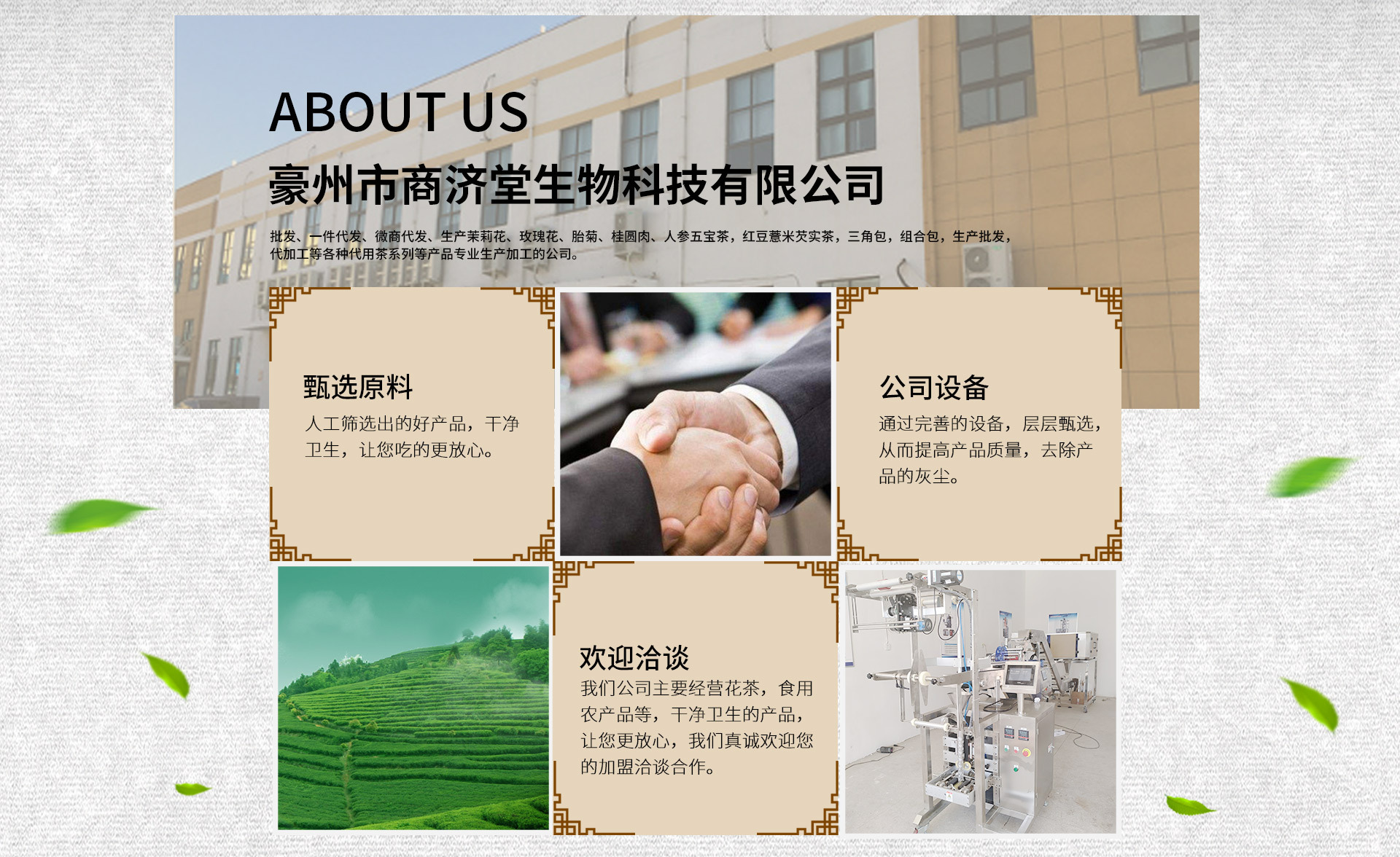 亳州市商濟堂生物科技有限公司是養生茶、罐裝花茶、袋泡茶、組合花茶、三角包花草茶等產品專業生產加工的公司,擁有完整、科學的質量管理體系。亳州市商濟堂生物科技有限公司的誠信、實力和產品質量獲得業界的認可。歡迎各界朋友蒞臨參觀、指導和業務洽談。