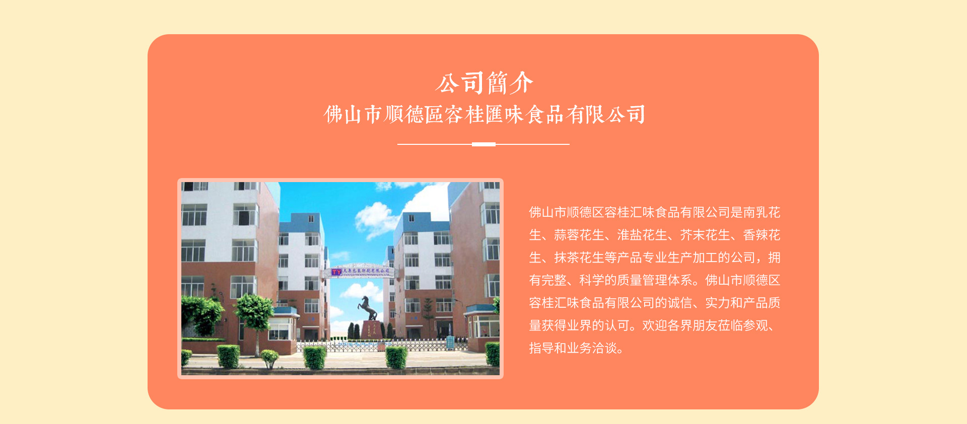 佛山市順德區容桂匯味食品有限公司是南乳花生、蒜蓉花生、淮鹽花生、芥末花生、香辣花生、抹茶花生等產品專業生產加工的公司,擁有完整、科學的質量管理體系。佛山市順德區容桂匯味食品有限公司的誠信、實力和產品質量獲得業界的認可。歡迎各界朋友蒞臨參觀、指導和業務洽談。