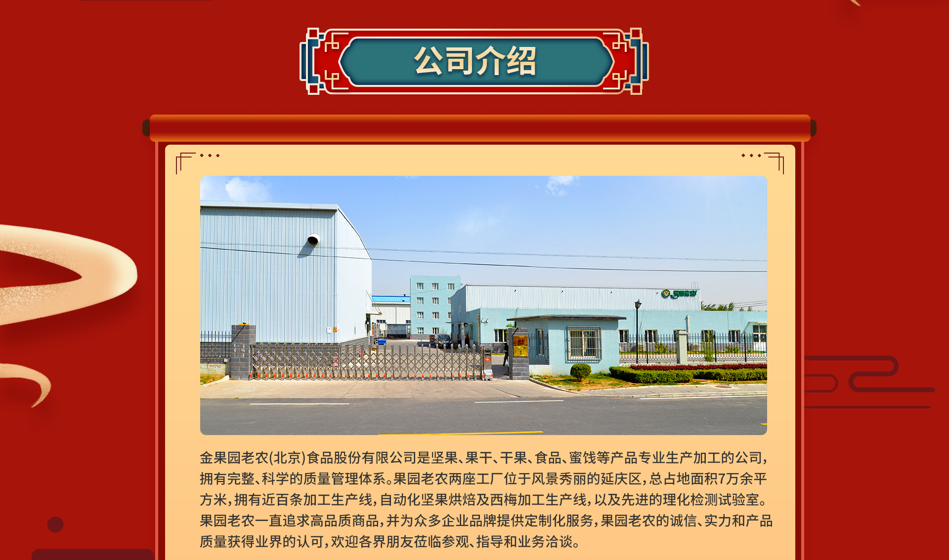 金果園老農(nóng)(北京)食品股份有限公司是堅(jiān)果、果干、干果、食品、蜜餞等產(chǎn)品專業(yè)生產(chǎn)加工的公司,擁有完整、科學(xué)的質(zhì)量管理體系。果園老農(nóng)兩座工廠位于風(fēng)景秀麗的延慶區(qū),總占地面積7萬(wàn)余平方米,擁有近百條加工生產(chǎn)線,自動(dòng)化堅(jiān)果烘焙及西梅加工生產(chǎn)線,以及先進(jìn)的理化檢測(cè)試驗(yàn)室。果園老農(nóng)一直追求高品質(zhì)商品,并為眾多企業(yè)品牌提供定制化服務(wù),果園老農(nóng)的誠(chéng)信、實(shí)力和產(chǎn)品質(zhì)量獲得業(yè)界的認(rèn)可,歡迎各界朋友蒞臨參觀、指導(dǎo)和業(yè)務(wù)洽談。
