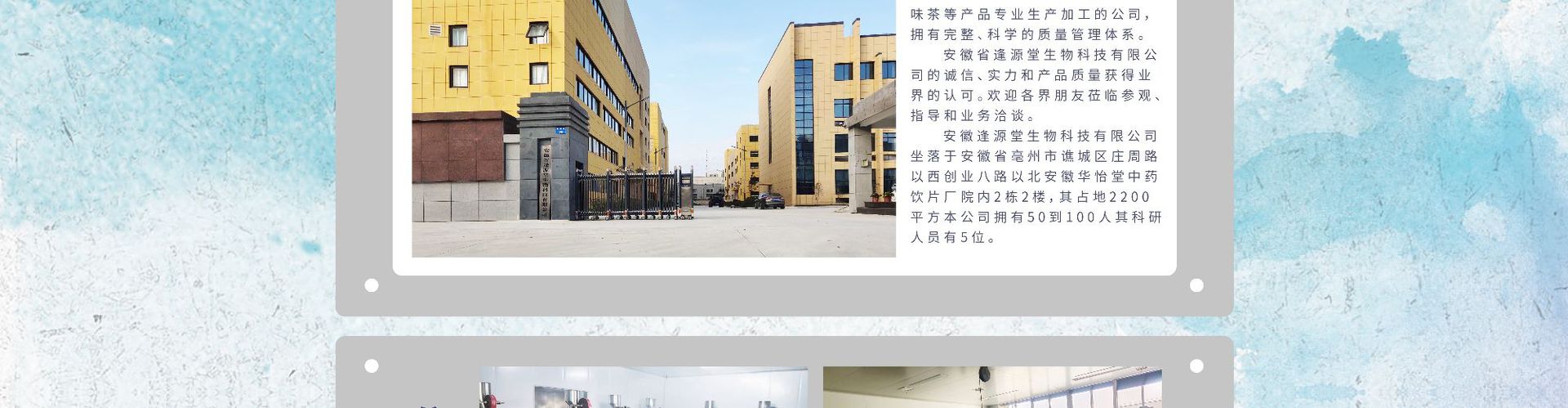 安徽省逢源堂生物科技有限公司是益生菌、固體飲料、袋泡茶、調味茶等產品專業生產加工的公司,擁有完整、科學的質量管理體系。安徽省逢源堂生物科技有限公司的誠信、實力和產品質量獲得業界的認可。歡迎各界朋友蒞臨參觀、指導和業務洽談。安徽逢源堂生物科技有限公司坐落于安徽省亳州市譙城區莊周路以西創業八路以北安徽華怡堂中藥飲片廠院內2棟2樓,其占地2200平方本公司擁有50到100人其科研人員有5位。本公司發貨速度也是非常快的。