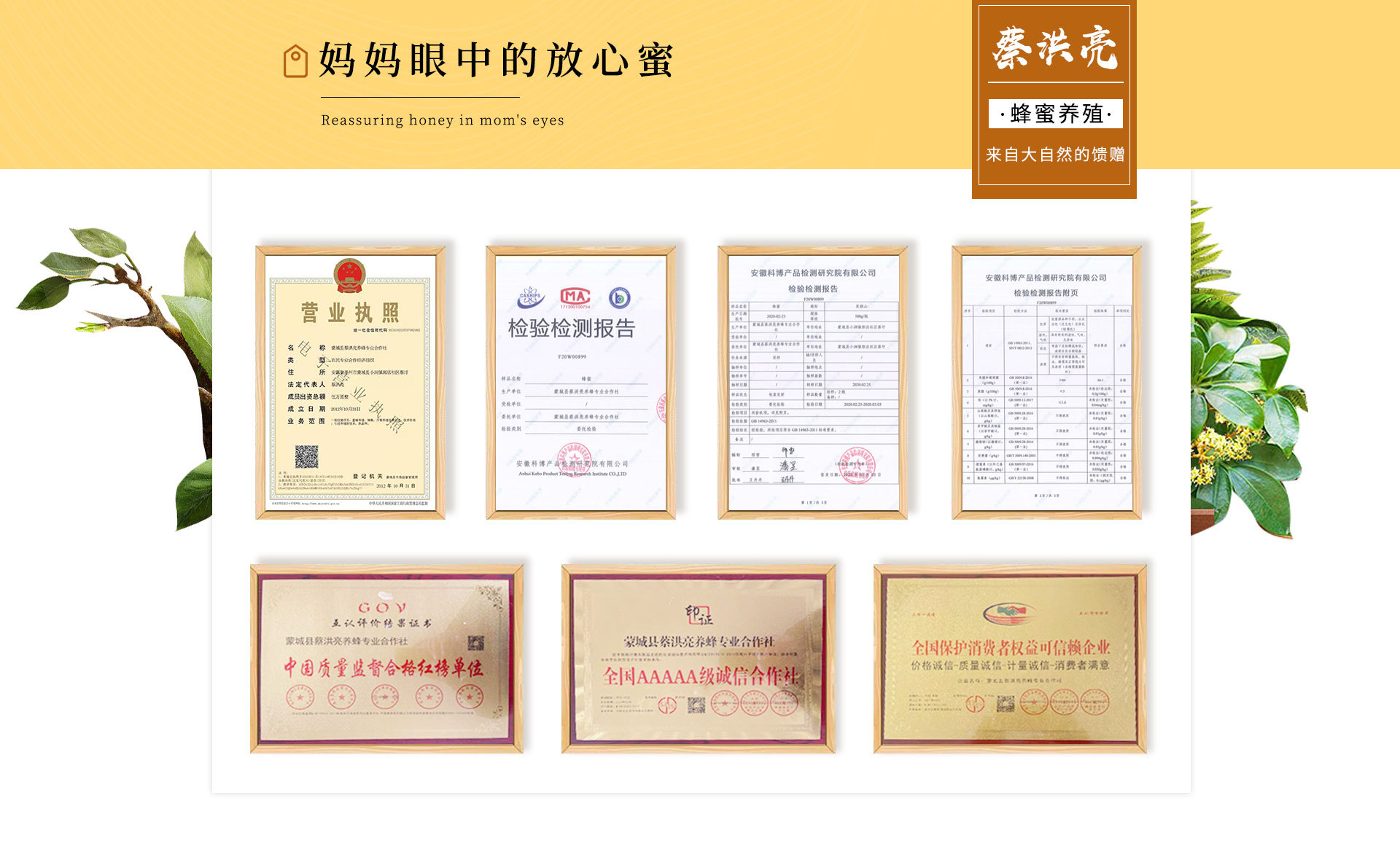 蒙城縣蔡洪亮養蜂專業合作社 經銷批發的蜂蜜、蜂蜜相關產品暢銷消費者市場,在消費者當中享有較高的地位,公司與多家零售商和代理商建立了長期穩定的合作關系。蒙城縣蔡洪亮養蜂專業合作社經銷的蜂蜜、蜂蜜相關產品品種齊全、價格合理。蒙城縣蔡洪亮養蜂專業合作社實力雄厚,重信用、守合同、保證產品質量,以多品種經營特色和薄利多銷的原則,贏得了廣大客戶的信任