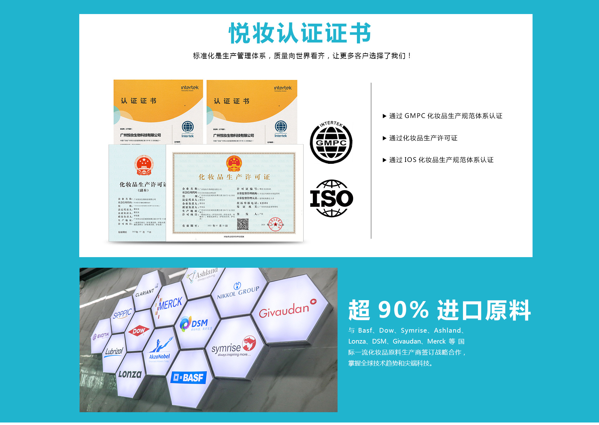 廣州悅妝生物科技有限公司是上海悅目化妝品有限公司旗下全資工廠,工廠成立于2018年,坐落于廣州從化區美都健康產業園。