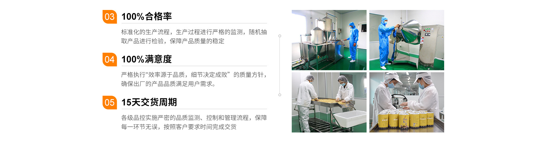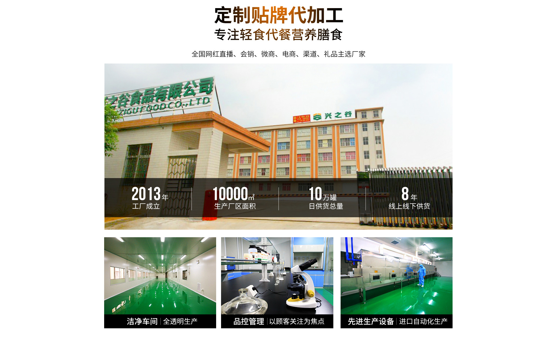 坐落于珠三角東岸經(jīng)濟帶黃金走廊的廣州市興之谷食品有限公司成立于2013年,是國內(nèi)首家集綠色健康食品研發(fā)、生產(chǎn)、推廣和保健養(yǎng)生為一體的現(xiàn)代化高新技術(shù)企業(yè)。 公司堅持以人為本,團隊協(xié)作,豐富的人力資源為公司的創(chuàng)新發(fā)展奠定了堅實的基礎(chǔ)。由國內(nèi)資深專業(yè)人才組成的產(chǎn)品核心研發(fā)團隊,與南韓及臺灣地區(qū)成熟健康食品專家顧問團隊建立了長期緊密合作關(guān)系。 廣州市興之谷食品作為食品行業(yè)的先鋒戰(zhàn)士,是國內(nèi)首家集綠色健康食品研發(fā)、生產(chǎn)、推廣和保健養(yǎng)生為一體的現(xiàn)代化企業(yè)。公司擁有萬級GMP標準化生產(chǎn)車間和化驗室,其中包括10000平方米的萬級GMP潔凈生產(chǎn)中心以及配套完善的產(chǎn)品檢驗中心和研發(fā)中心。先進的科研儀器、生產(chǎn)設(shè)備、全自動生產(chǎn)流水線和質(zhì)量控制檢驗儀器,配備杯裝,全自動罐裝,盒裝生產(chǎn)線,擁有清洗,甩干,蒸煮、低溫烘焙,超細研磨,混合、封裝等工藝設(shè)備,可提供來料加工、OEM 貼牌,代加工等服務。