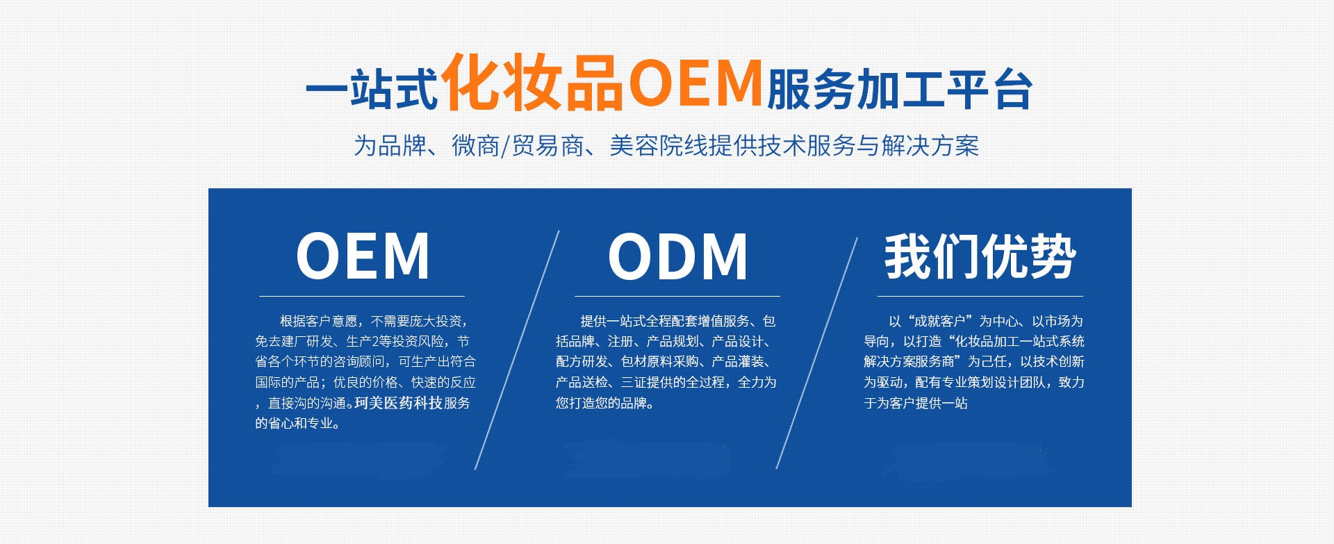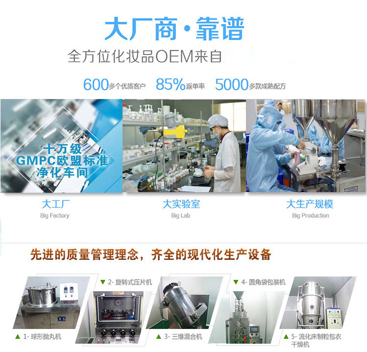 廣東珂美醫藥科技有限公司是一家化妝品,消字號,械字號,防爆車間,包裝印刷一條龍的OEM代加工工廠,專業從事化妝品研發、策劃、生產為一體的集團化化妝品企業,專注于各種類面膜及中高檔化妝品品牌及半成品的OEM/ODM加工及品牌的區域代理、批發、銷售,生產廠房1.2萬平方米,并且通過了歐盟GMP生產質量認證,完善的質量管理和嚴格的檢測系統,確保最終產品的質量,從事多年大型企業和知名化妝品企業的技術管理團隊,專業化的服務為你提供優質產品、優質服務。公司憑借高素質的科研人員、雄厚的技術實力,強大的生產能力,始終堅持“品質決定生存”的原則,嚴把質量關,確保產品質量。現主公司在全國各地展開大規模的品牌推廣活動和產品促銷活動,造就了公司產品“國際品牌,國貨價格”的強大優勢。讓品牌深入人心,廣為信賴。