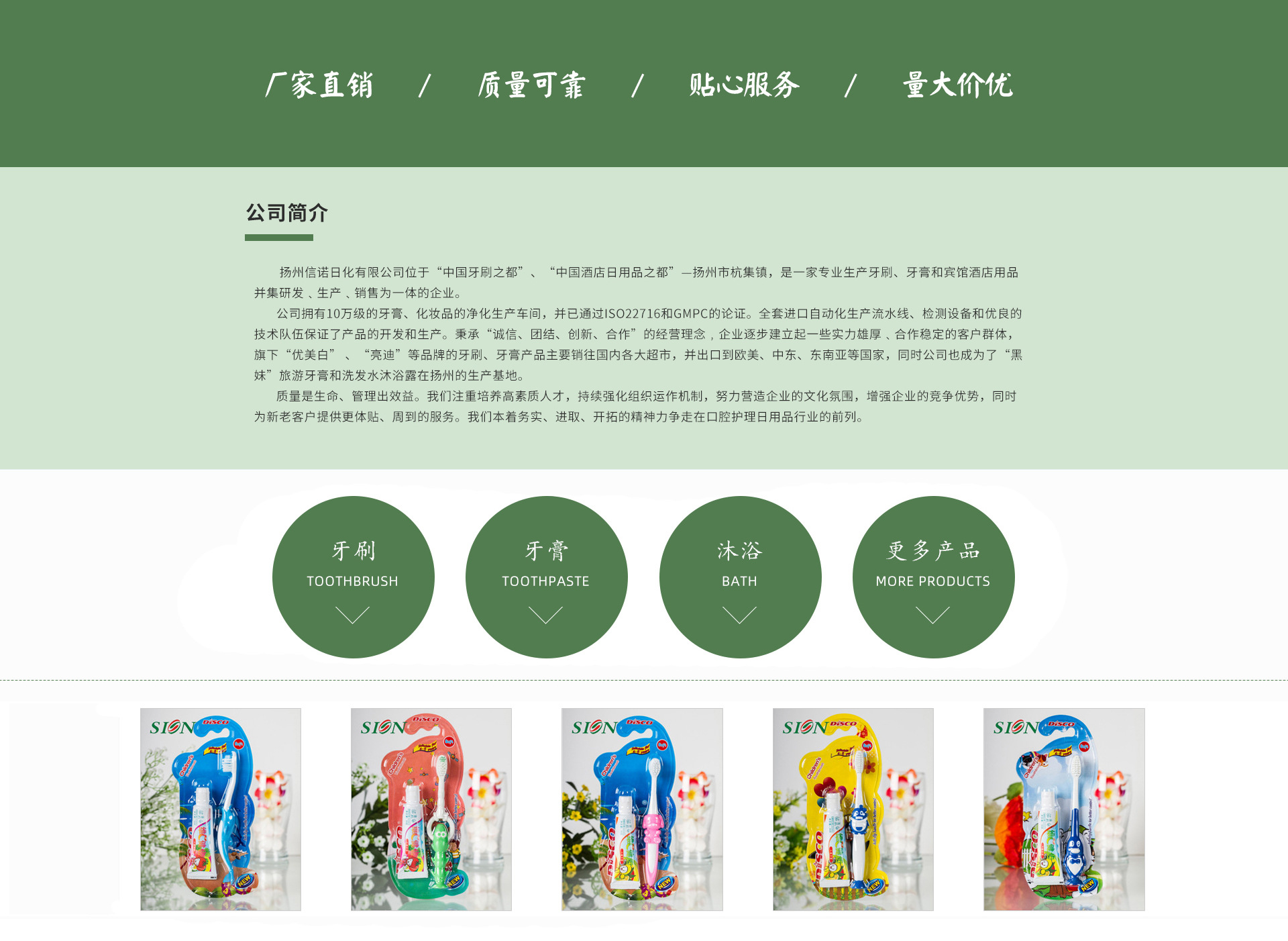 揚州信諾日化有限公司,是一家專業生產牙膏及酒店洗漱用品的企業。公司擁有10萬級牙膏、化妝品潔凈車間,萬級實驗室潔凈車間,并已通過歐盟《化妝品良好操作規范》(ISO22716& Good Manufacturing Practice,簡稱GMPC)及美國食品藥品監督管理局( Food and Drug Administration,簡稱FDA)官方認證。全套進口自動化生產流水線、完整的實驗檢測設備和優秀的專業技術隊伍全方位保證了產品的生產和開發。 公司秉承“創新、誠信、合作、共贏”的經營理念﹐逐步建立起實力雄厚﹑合作穩定的客戶群體,如南京同仁堂綠金家園保健品有限公司(“南京同仁堂”品牌)、康博士日化集團有限公司(“黑妹”、“康博士”品牌)、恒康醫療集團股份有限公司(“獨一味”品牌)、英國專業個人護理用品奢侈品牌“seven plus”等,產品囊括旅游牙膏、商超牙膏,銷售范圍廣泛。