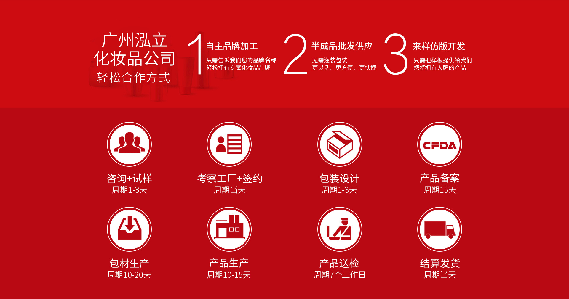 您好!歡迎光臨廣州泓立化妝品企業!本公司專業承接 oem//odm加工生產,從商標注冊,品牌設計,產品研發,生產,包裝,運輸為一體的化妝品加工服務,為化妝品連鎖店,美容院,,電商精英 輕松打造自有品牌!