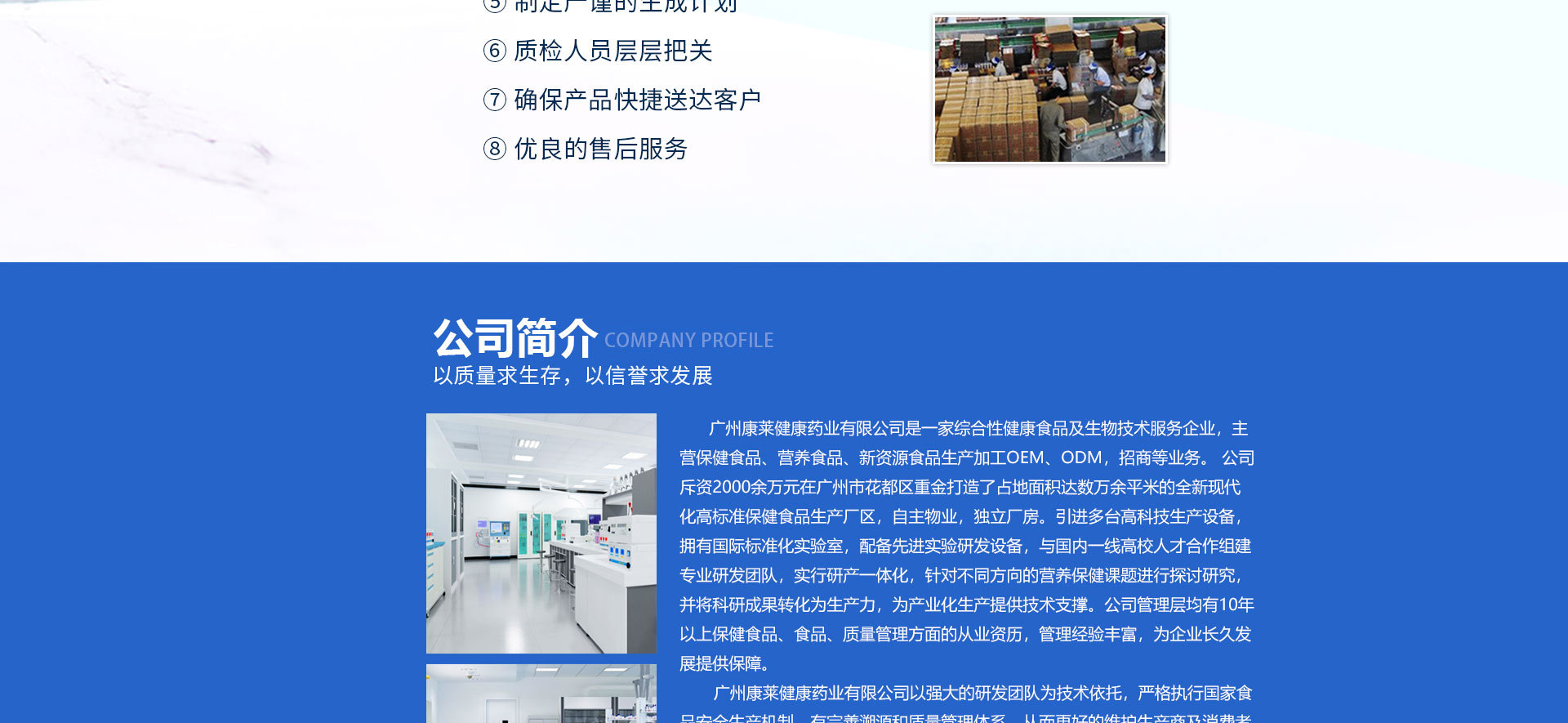 廣州康萊健康藥業有限公司是一家綜合性健康食品及生物技術研發服務企業,主營保健食品、營養食品、新資源食品生產加工OEM、ODM,招商等業務。 公司斥資2000余萬元在廣州市花都區重金打造了占地面積達數千余平米的全新現代化高標準保健食品生產廠區,自主物業,獨立廠房。引進多臺高科技生產設備,擁有國際標準化實驗室,配備先進實驗研發設備,與國內一線科研人才合作組建專業研發團隊,實行研產一體化,并將科研成果轉化為生產力,為產業化生產提供技術支撐。為企業長久發展提供保障。 廣州康萊健康藥業有限公司以強大的研發團隊為技術依托,嚴格執行國家食品安全生產機制,原料產地經過嚴格把關;目前公司產品涵蓋保健食品、固體飲料、壓片糖果、方便食品、代用茶五大類產品,上千種細類產品。其中包括小分子肽、益生菌、代餐粉、膠原蛋白、瑪咖、酵素、蛋白質粉、代用茶等多種市場熱門產品,是優選客戶合作的最佳伙伴。