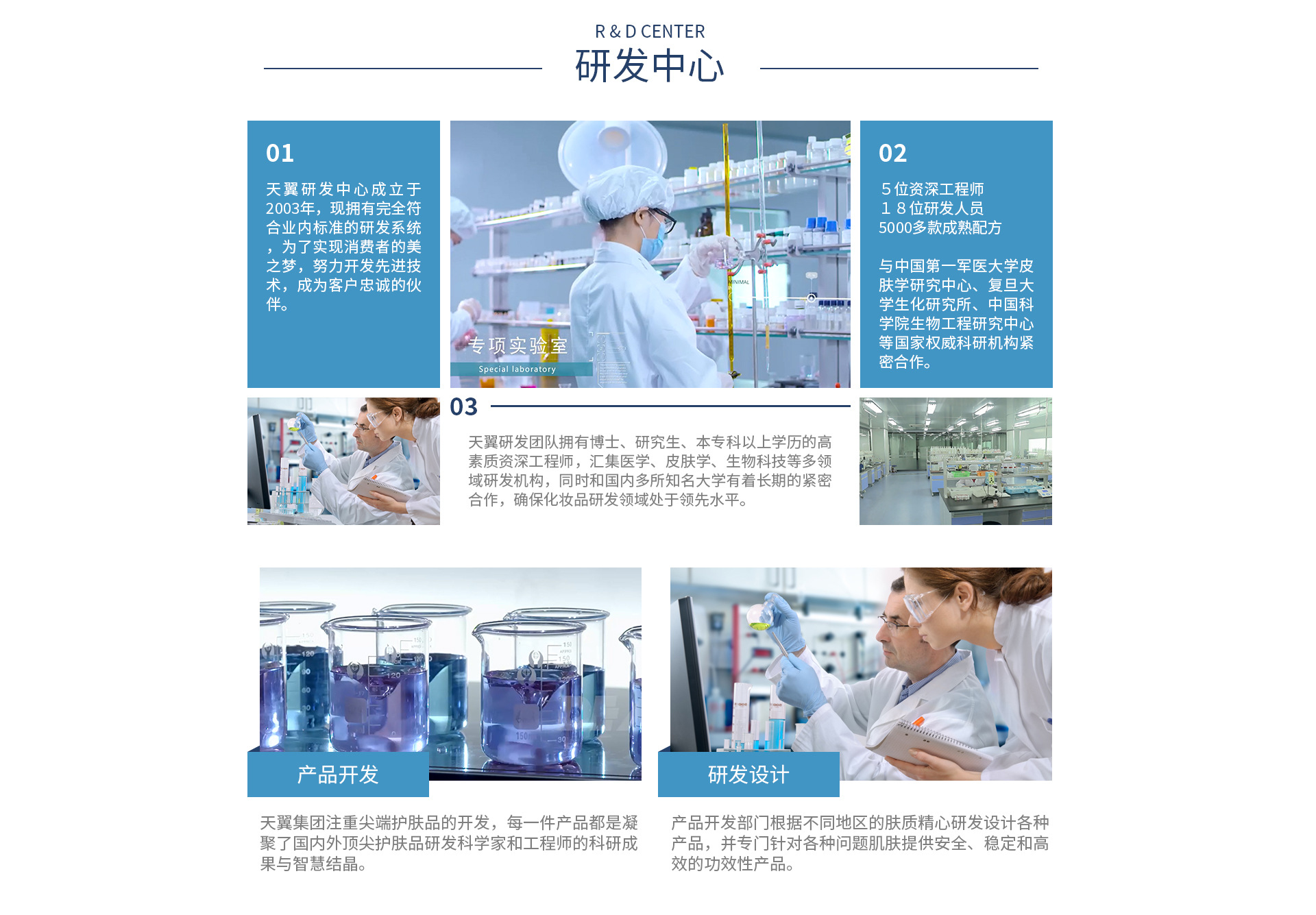 香港天驥集團(tuán)-廣州天翼化妝品有限公司生產(chǎn)加工基地 是集美容品研發(fā)、生產(chǎn)、OEM、ODM加工、品牌營銷、連鎖專賣、教育訓(xùn)練、國際貿(mào)易于一體的高科技美容企業(yè)集團(tuán),橫跨專業(yè)線和日化線,是全國工商聯(lián)化妝品商會和廣東省美容美發(fā)協(xié)會常務(wù)理事單位,中國市場質(zhì)量服務(wù)誠信建設(shè)示范單位。旗下?lián)碛兄袊缞y行業(yè)最先進(jìn)的生產(chǎn)基地,現(xiàn)已發(fā)展為中國最具影響力的美容化妝品企業(yè)之一。