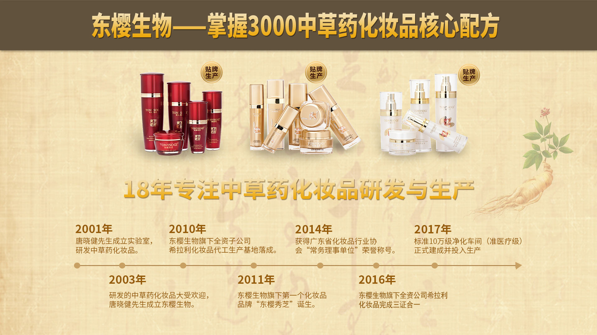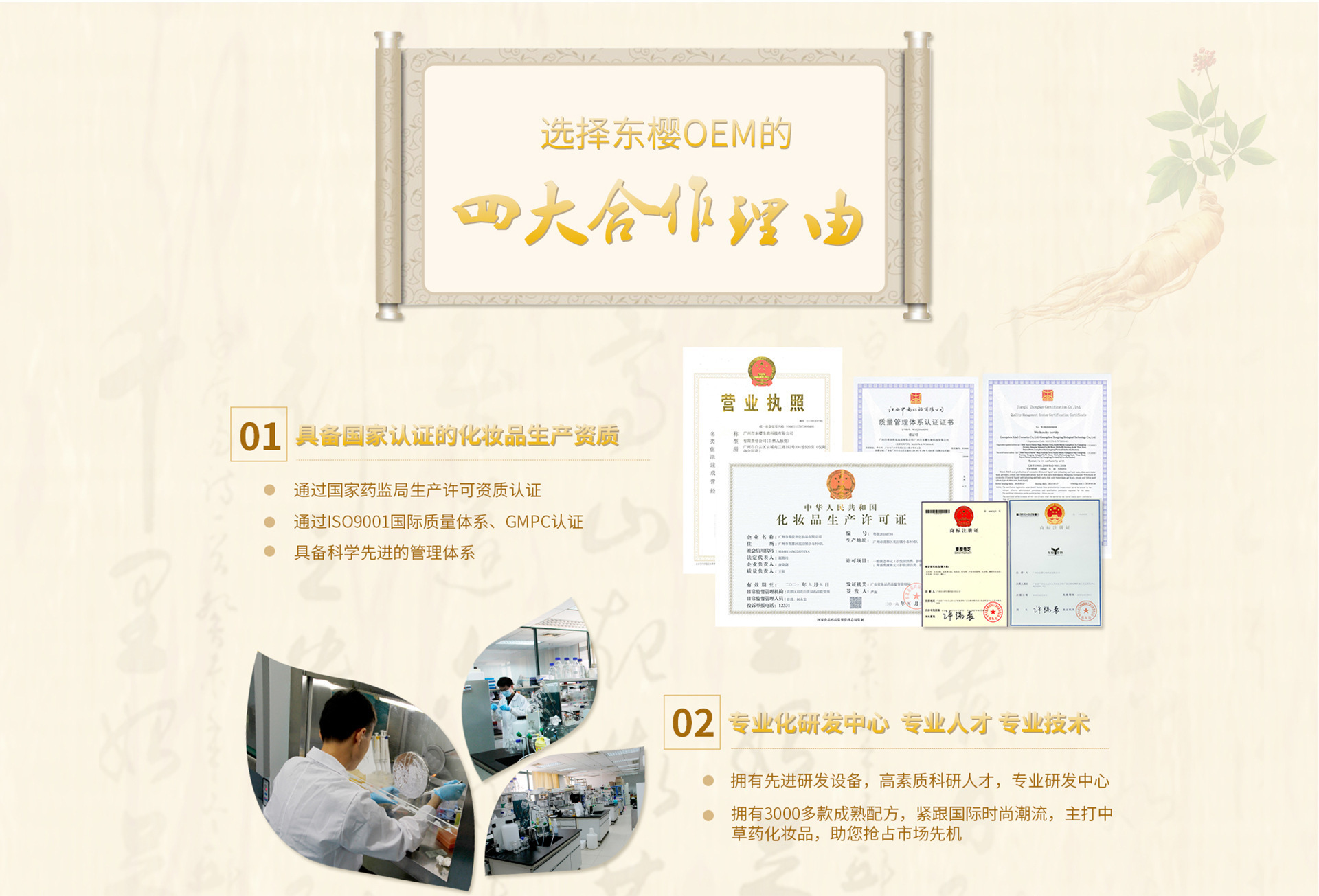 廣州市東櫻生物科技有限公司是國(guó)內(nèi)早期從事草本化妝品、生物技術(shù)化妝品研發(fā)與代工為主的高新科技企業(yè)之一,其生產(chǎn)基地廣州市希拉利化妝品有限公司(東櫻全資子公司)位于廣州市花都區(qū),占地10000多平方米,已通過(guò)ISO9001國(guó)際質(zhì)量體系認(rèn)證。公司擁有多臺(tái)全自動(dòng)面膜機(jī)、灌裝機(jī)、塑封機(jī)、包裝機(jī)等高新科研設(shè)備;聚集了一大批高素質(zhì)人才,核心工程師具有國(guó)際研發(fā)和管理經(jīng)驗(yàn)。19年來(lái),東櫻專(zhuān)注草本與現(xiàn)代生物科技研發(fā)與生產(chǎn),開(kāi)發(fā)出清痘凈顏、特色產(chǎn)品、草本油、煥顏修護(hù)、植物粉類(lèi)、男士護(hù)理、保濕靚膚、精華泥膏、胸部護(hù)理、輕盈緊膚、女士護(hù)理等11個(gè)系列種類(lèi)達(dá)3000多種產(chǎn)品,數(shù)十種國(guó)內(nèi)主流產(chǎn)品,十幾項(xiàng)專(zhuān)利技術(shù)及專(zhuān)利產(chǎn)品。其中液體針灸及睡眠液等新型產(chǎn)品均已通過(guò)了專(zhuān)利審核并已投放市場(chǎng),得到了眾多客戶(hù)的認(rèn)可。 本公司已成功為海內(nèi)外5000多家美容機(jī)構(gòu)及化妝品公司提供原料及半成品批發(fā)及OEM/ODM代工服務(wù),口碑享譽(yù)業(yè)內(nèi)!