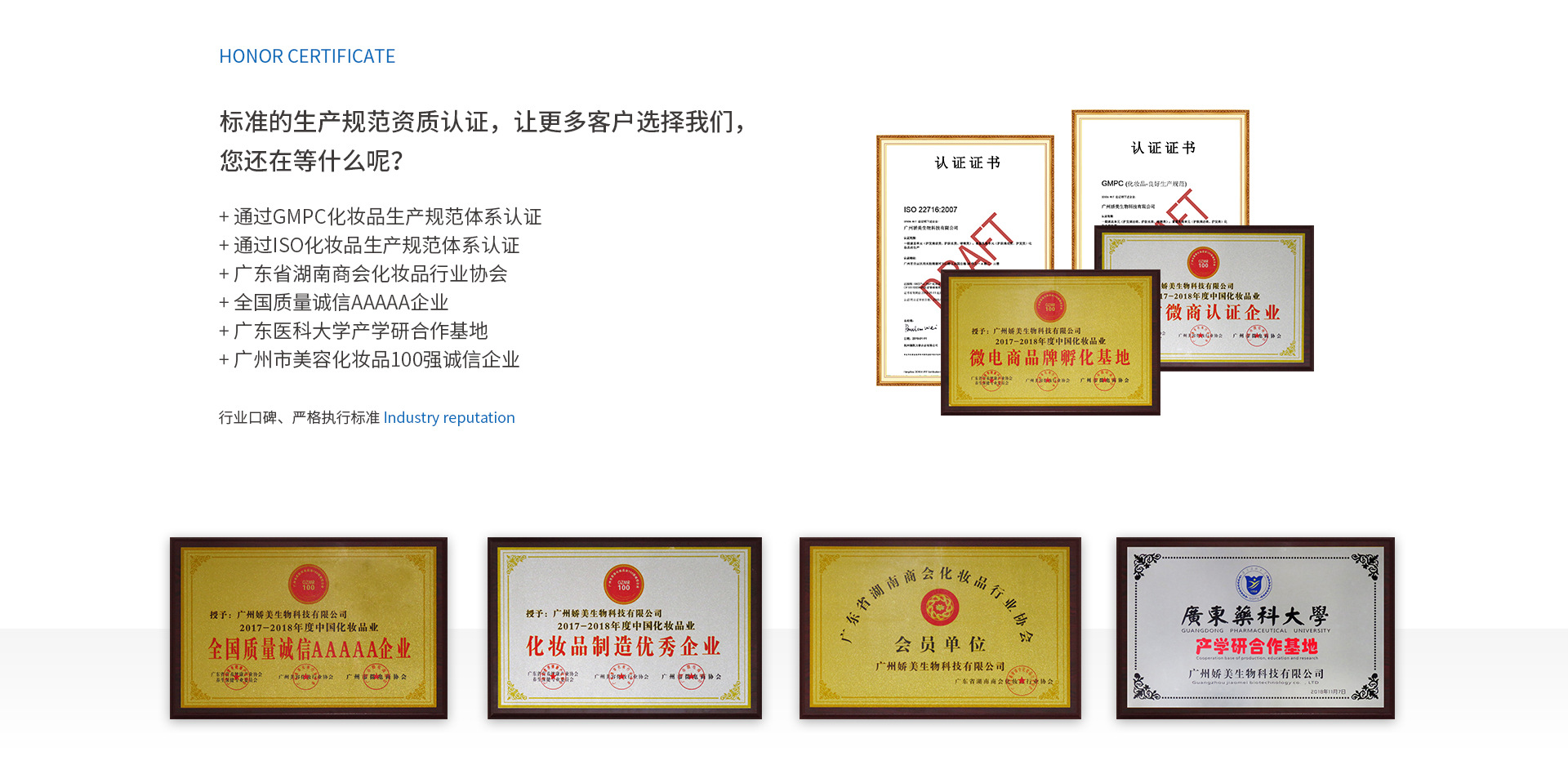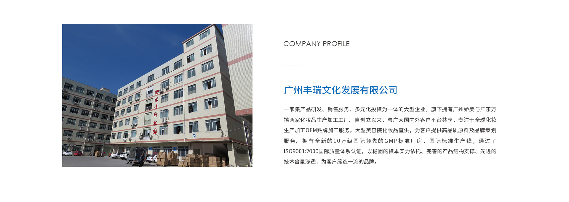 廣州豐瑞文化發展有限公司是一家集產品研發、銷售服務、多元化投資為一體的大型企業。旗下擁有廣州嬌美與廣東萬禧兩家化妝品生產加工工廠。自創立以來,與廣大國內外客戶平臺共享,專注于全球化妝生產加工OEM貼牌加工服務,大型美容院化妝品直供,為客戶提供高品質原料及品牌策劃服務。擁有全新的10萬級國際領先的GMP標準廠房,國際標準生產線,通過了ISO9001:2000國際質量體系認證,以穩固的資本實力依托、完善的產品結構支撐、先進的技術含量滲透,為客戶締造一流的品牌。 公司現與百余家國內外代工客商保持長期密切合作,以誠信與實力,深得國內外廣大客戶的依賴!十余年的行業沉淀,嬌美吸取OEM/ODM服務之精髓,以專業知名品牌的經驗、豐富的產品結構、不斷創新的務實精神,以中國知名專業化妝品代工生產商為目錄。 嬌美的企業經營理念是:幫客戶產品升級,助員工實現夢想。