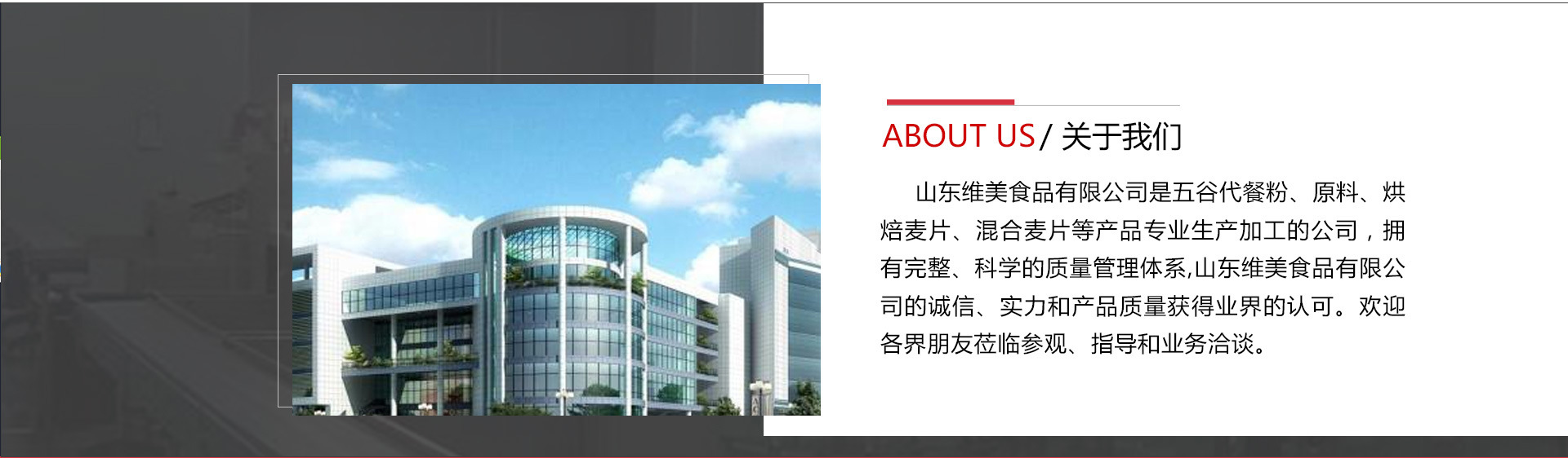 山東維美食品有限公司是五谷代餐粉、原料、烘焙麥片、混合麥片等產品專業生產加工的公司,擁有完整、科學的質量管理體系。山東維美食品有限公司的誠信、實力和產品質量獲得業界的認可。歡迎各界朋友蒞臨參觀、指導和業務洽談。