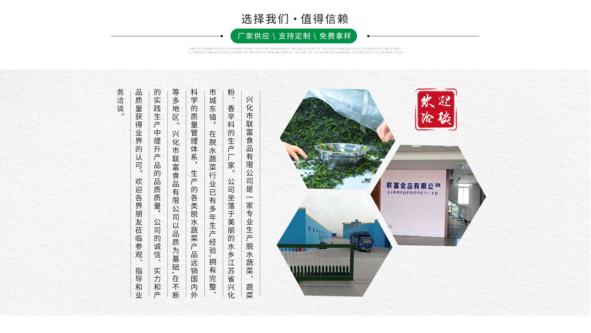 興化市聯(lián)富食品有限公司組建于1999年,是一家集生產(chǎn)、研發(fā)、銷售為一體的省級農(nóng)業(yè)產(chǎn)業(yè),也是一家農(nóng)業(yè)生態(tài)循環(huán)型企業(yè),所處的興化市脫水蔬菜加工園區(qū)是本地食品脫水蔬菜生產(chǎn)基地之一,廠區(qū)面積20000平方米,固定資產(chǎn)4300多萬元,職工人數(shù)410人,研發(fā)人員26人,擁有研究所工作站。公司擁有全新的生產(chǎn)設(shè)備、完善的檢測手段,公司已通過ISO9001-2000認證、HACCP認證、猶太認證、BRC認證。常年生產(chǎn)各類脫水蔬菜及調(diào)味品,年產(chǎn)脫水蔬菜7000多噸,產(chǎn)品銷往韓國、臺灣、歐洲、等20多個國家和地區(qū),并與4家世界500強企業(yè)建立了合作關(guān)系。2013年實現(xiàn)銷售收入1.5億多元,出口創(chuàng)匯1000多萬美元。 公司一直緊扣外向型農(nóng)業(yè)發(fā)展,以發(fā)展無公害農(nóng)產(chǎn)品增效、綠色食品為目標,加大科技投入,把現(xiàn)代農(nóng)業(yè)與工業(yè)結(jié)合的優(yōu)勢發(fā)揮出來。力爭建立脫水蔬菜原料標準化生產(chǎn)基地15000畝,推動當?shù)剞r(nóng)業(yè)產(chǎn)業(yè)結(jié)構(gòu)調(diào)整